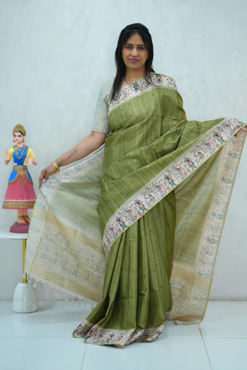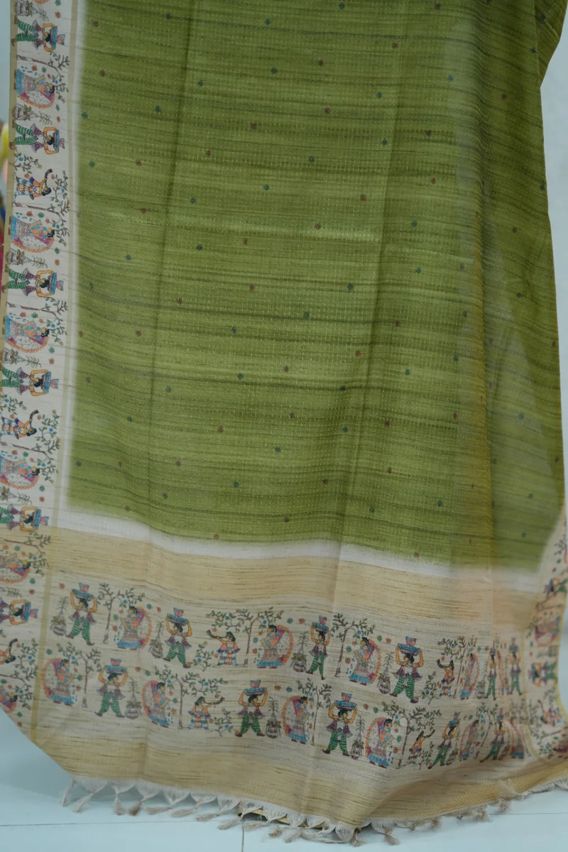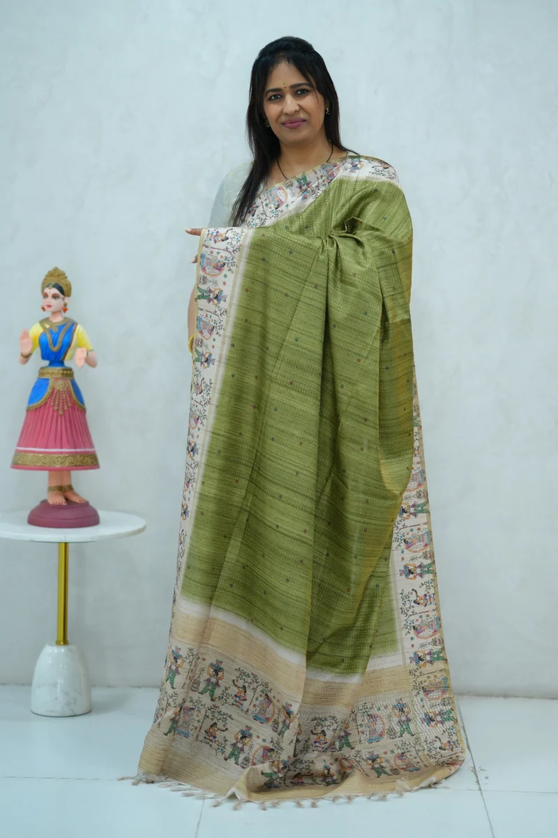 Description: Blended Tussar Silk Saree green & beige colour border with beautiful print all over the saree with madhubani printed border and pallu with contrast blouse 1. Material: Semi Tussar Silk 2. Blouse: attached
