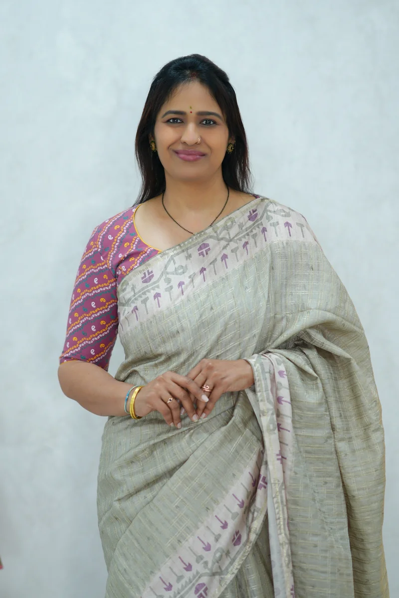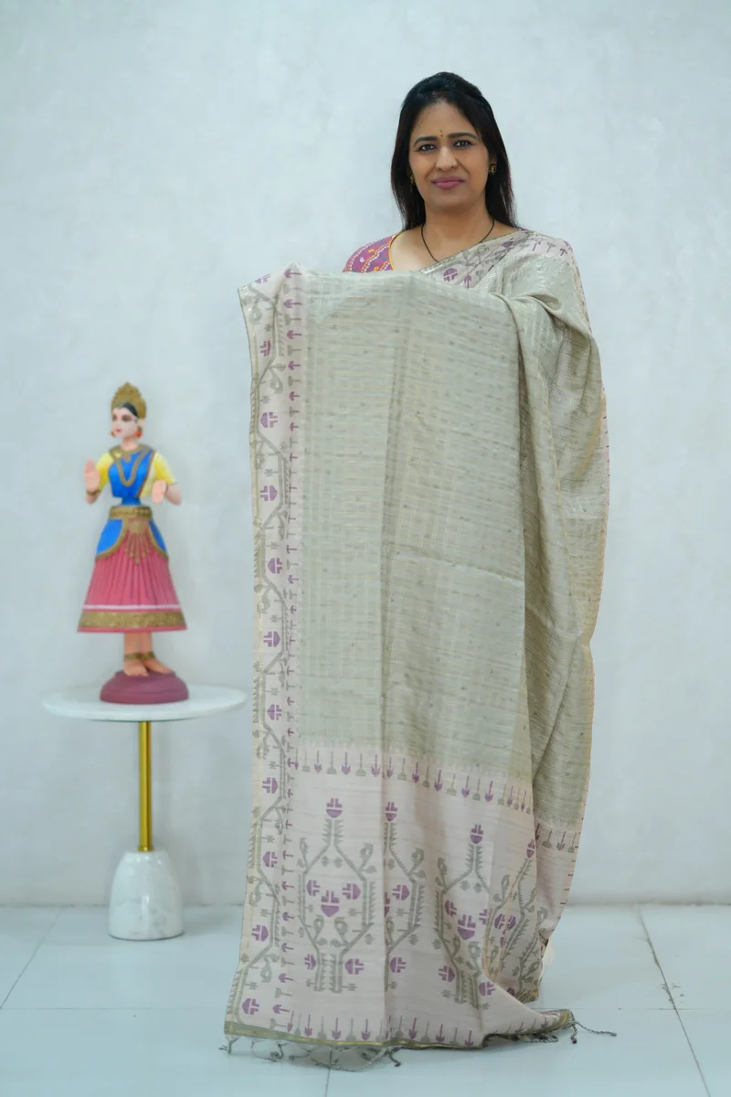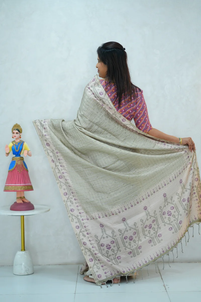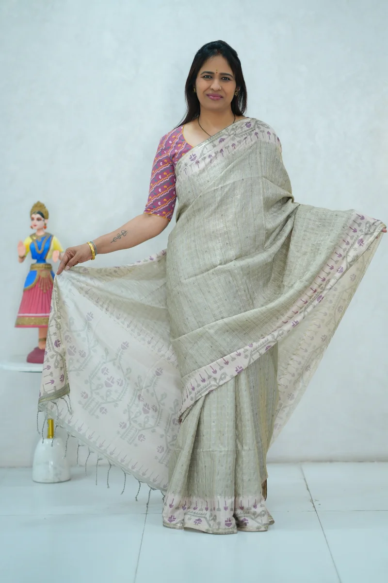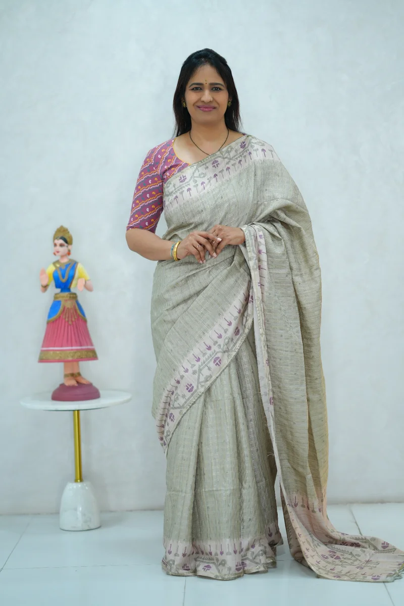 Description: Blended Tussar Silk Saree in pastel grey & beige colour with geometrical printed border and pallu with contrast blouse 1. Material: Semi Tussar Silk 2. Blouse: attached