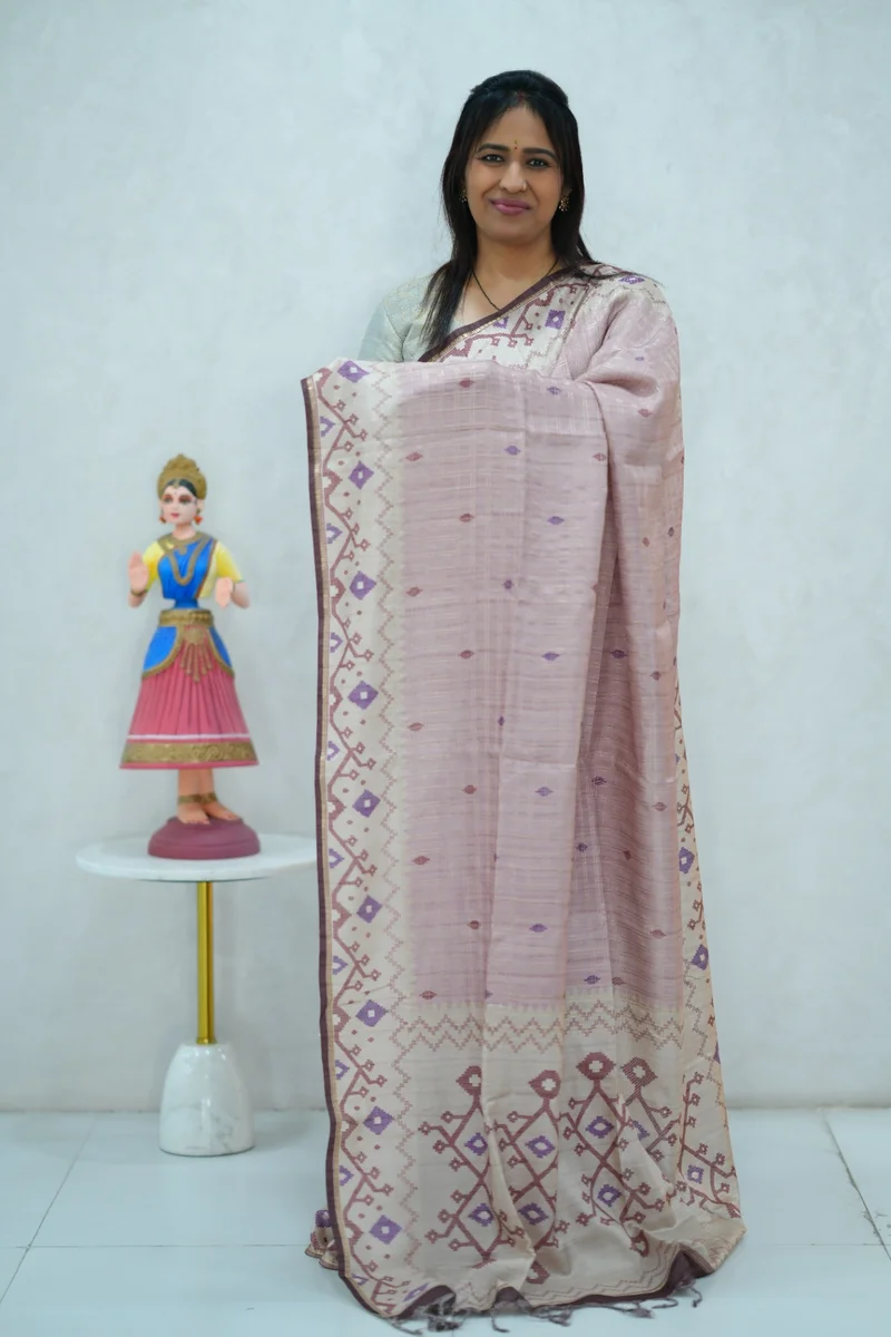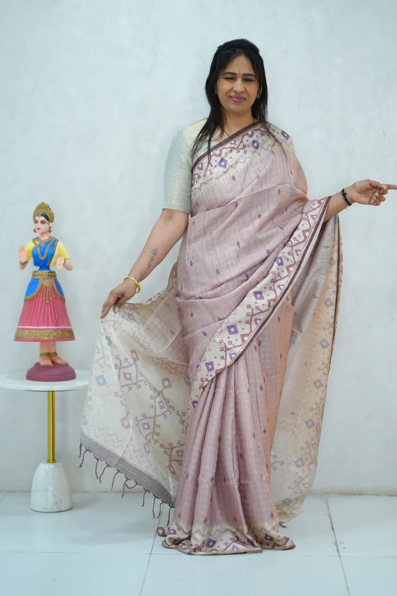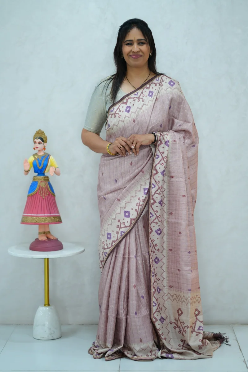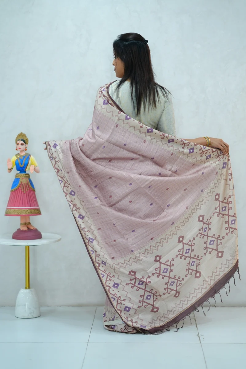 Description: Blended Tussar Silk Saree in pastel shade& beige colour border with beautiful print all over the saree with geometricalr printed border and pallu with contrast blouse 1. Material: Semi Tussar Silk 2. Blouse: attached