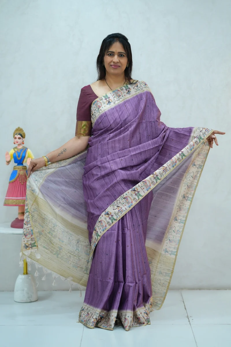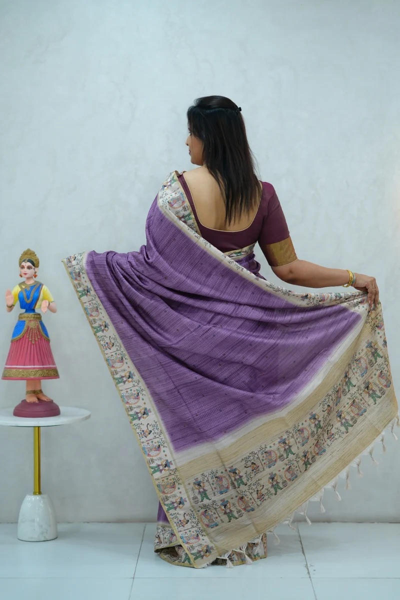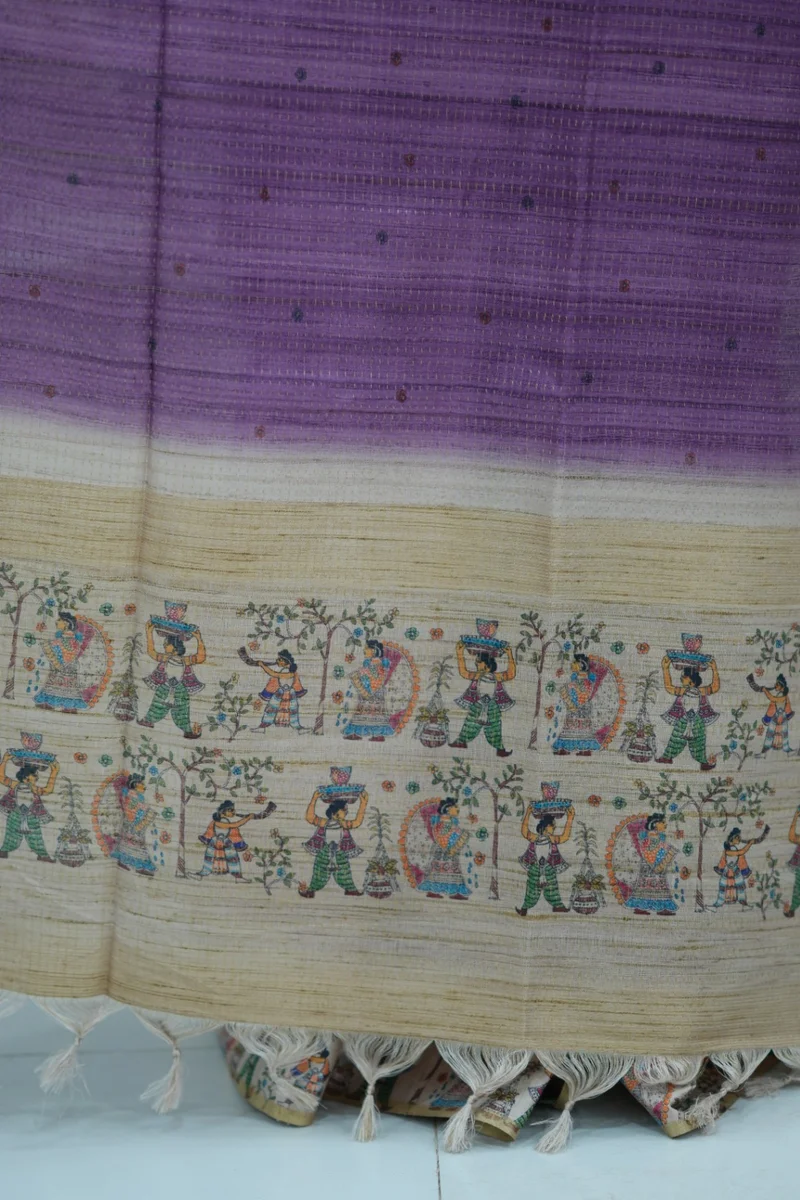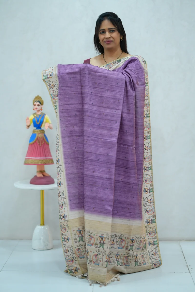 Description: Blended Tussar Silk Saree lavender & beige colour border with beautiful print all over the saree with madhubani printed border and pallu with contrast blouse 1. Material: Semi Tussar Silk 2. Blouse: attached