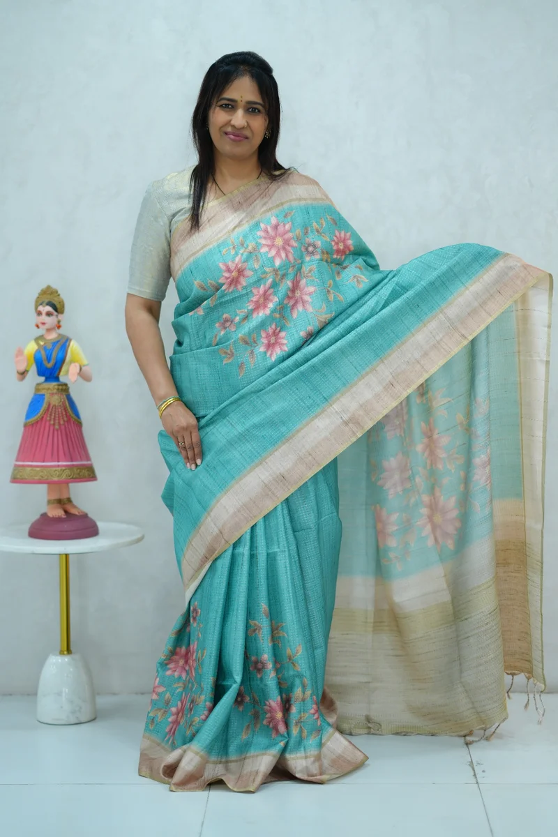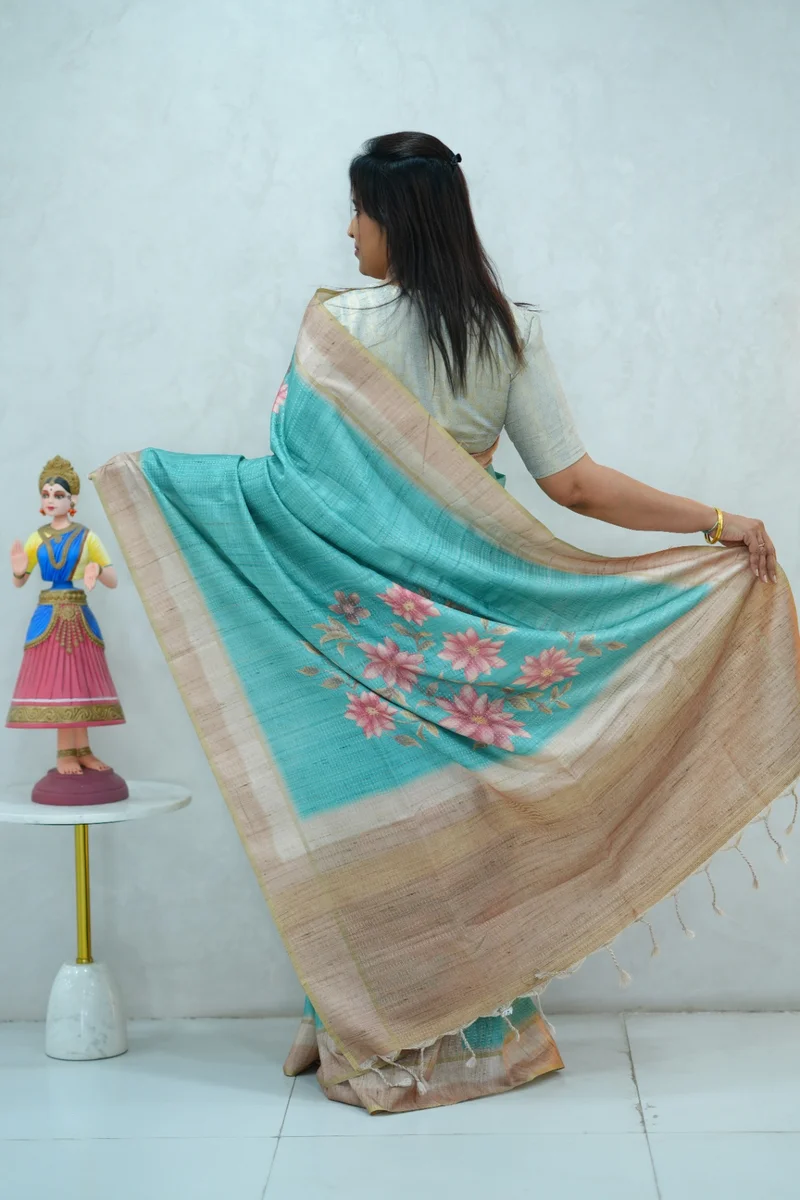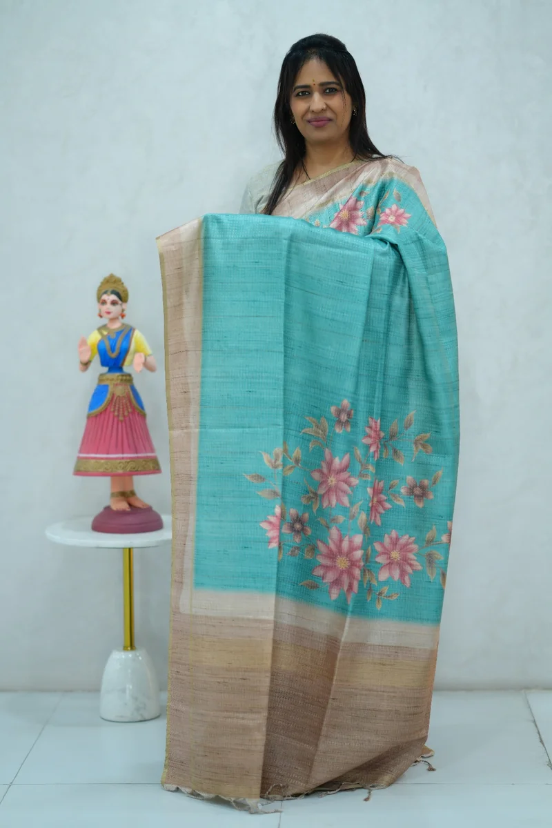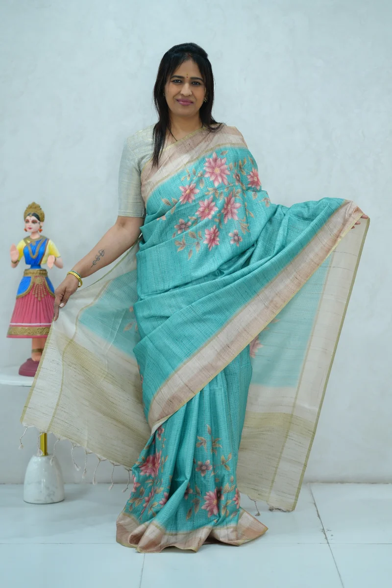 Description: Blended Tussar Silk Saree sky blue & beige colour border saree with floral printed border and pallu with contrast blouse 1. Material: Semi Tussar Silk 2. Blouse: attached