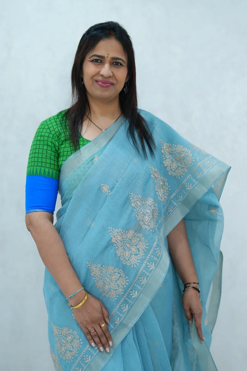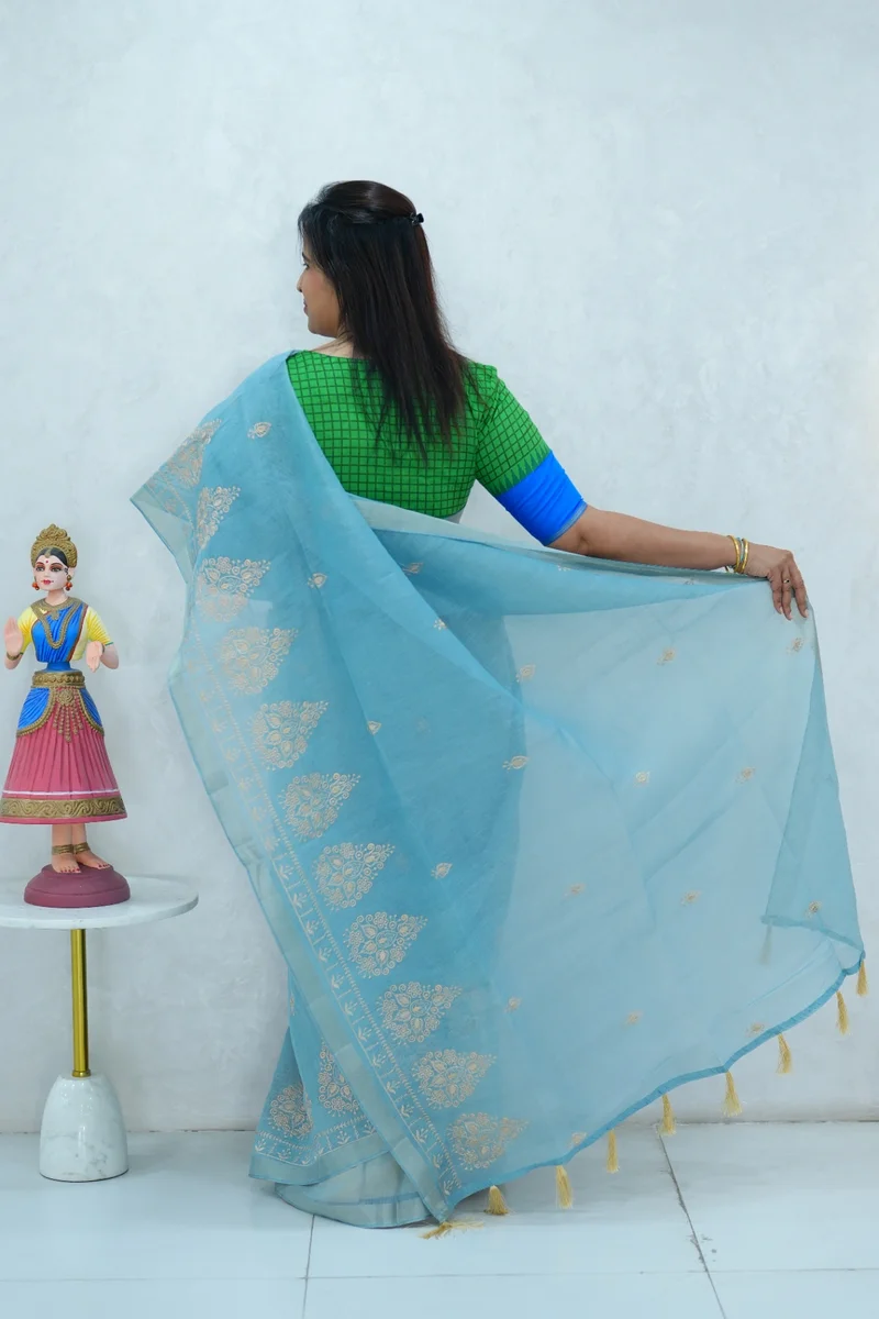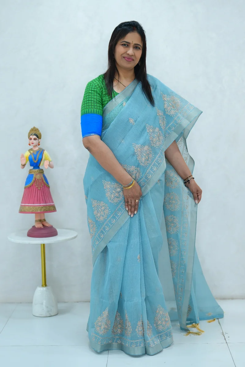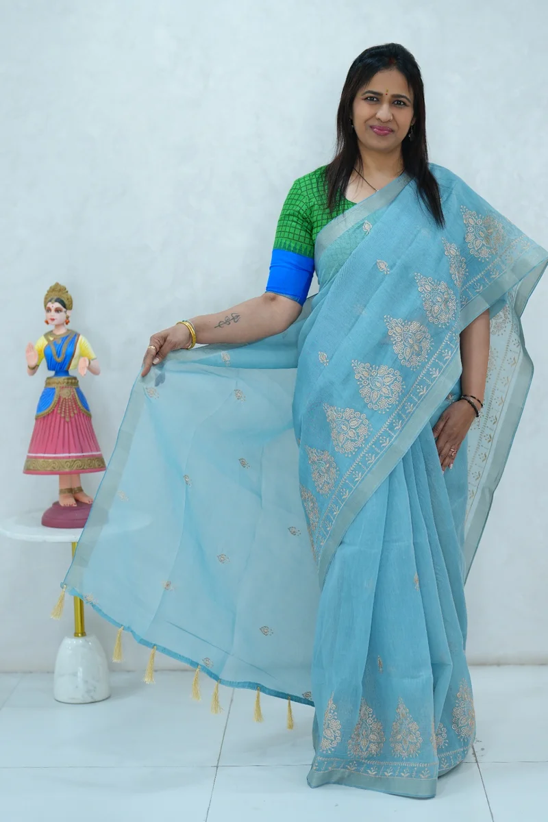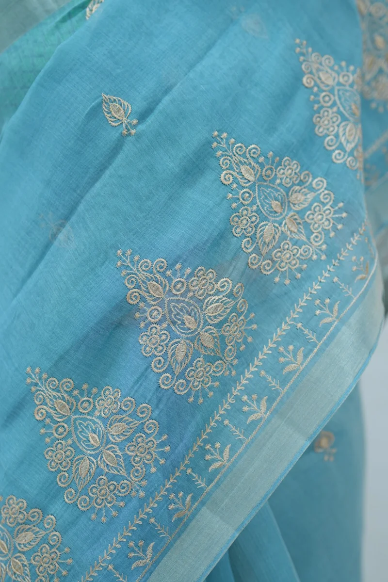 Description: Cotton Silk saree blue with thread buttas, zari border and floral design embroidery work border with blouse 1. Material: Cotton Silk 2. Blouse: attached