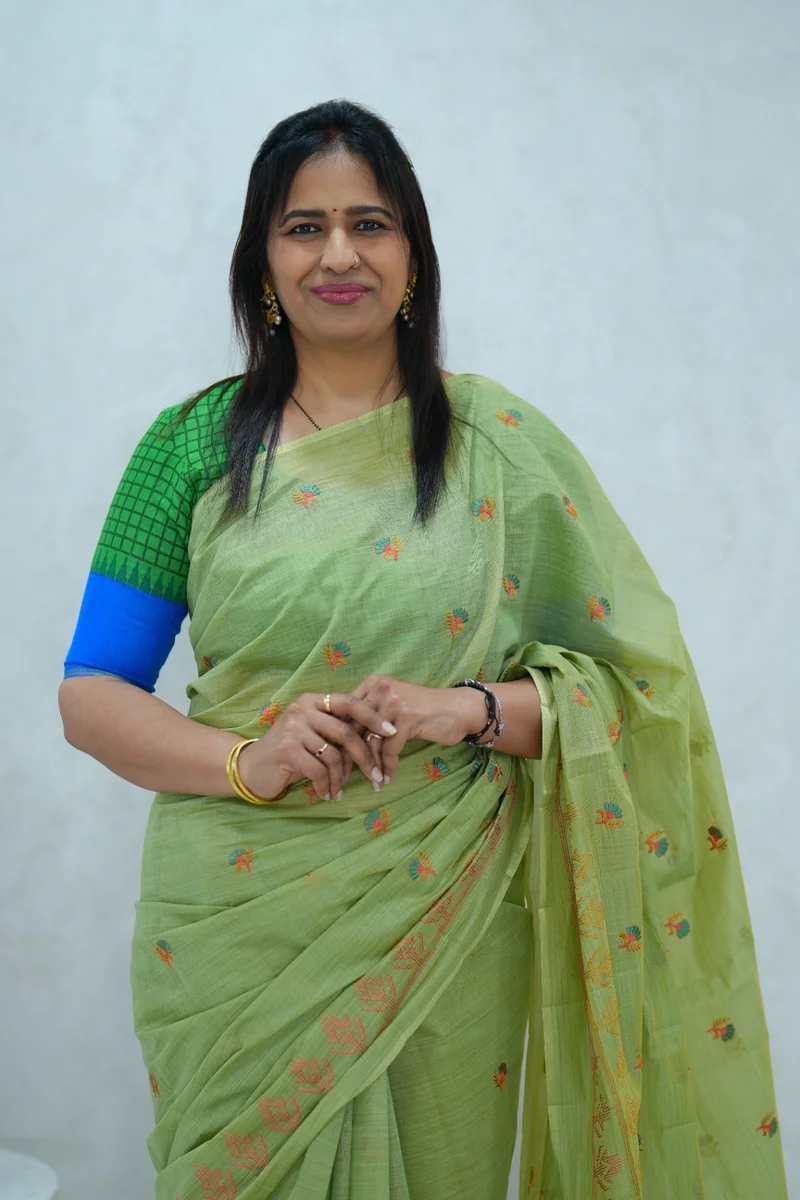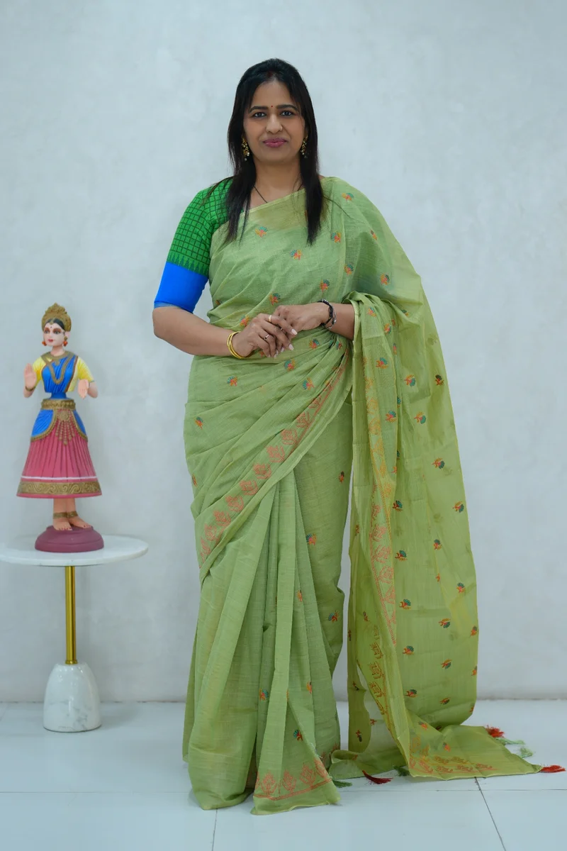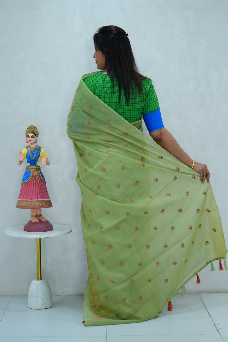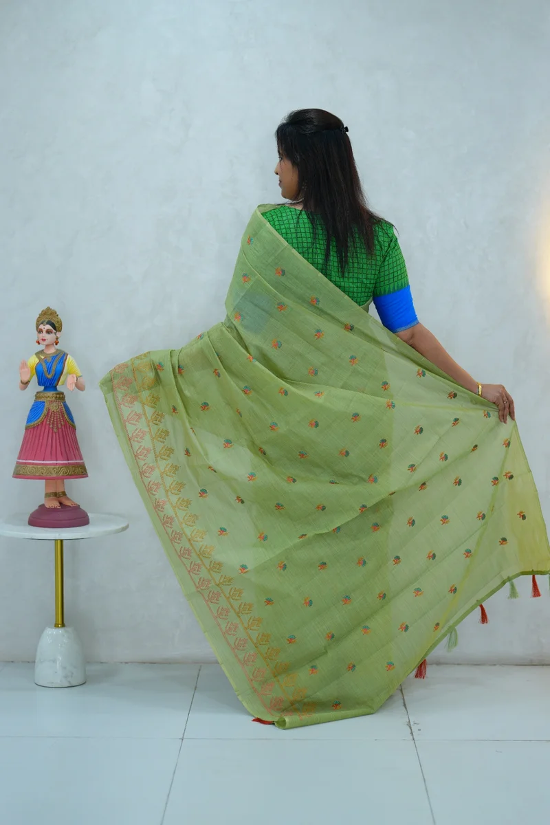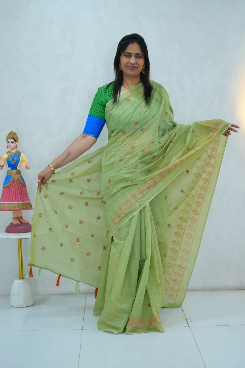 Description: Cotton Silk saree green with all over thread buttas and floral design embroidery work border with blouse 1. Material: Cotton Silk 2. Blouse: attached