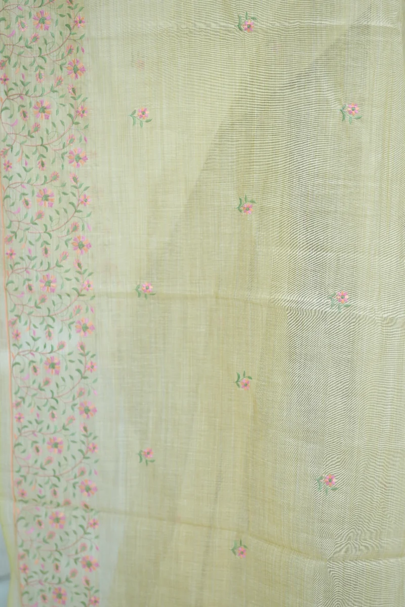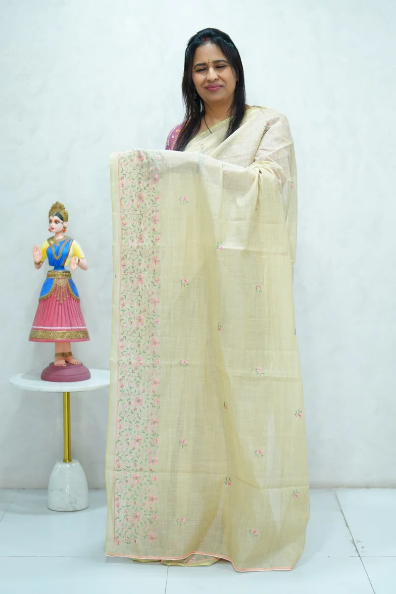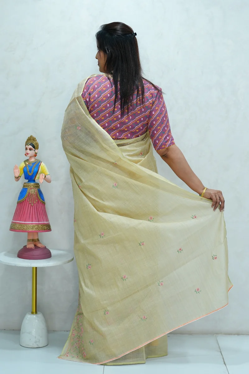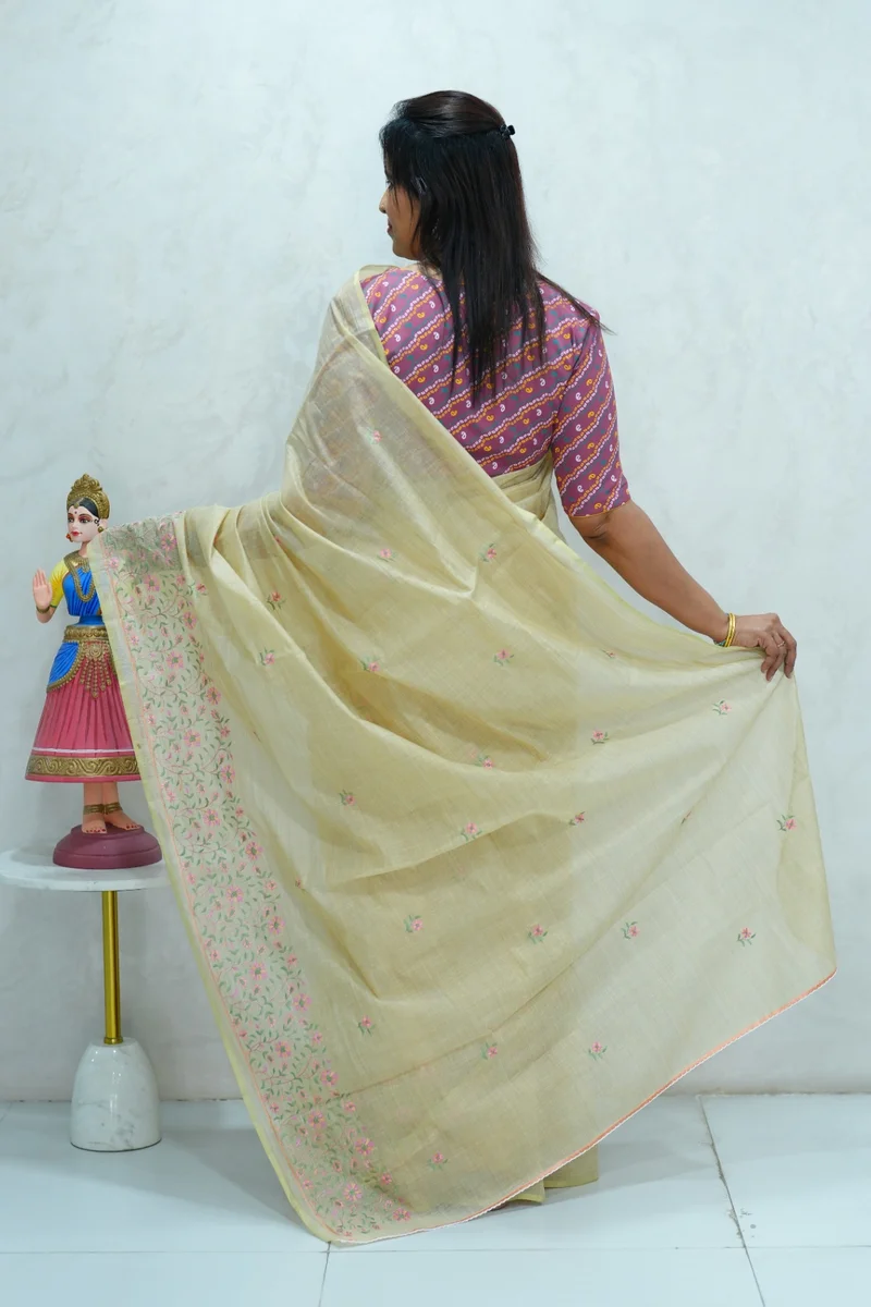 Description: Cotton Silk saree pastel yellow with all over thread buttas and floral design embroidery work border with blouse 1. Material: Cotton Silk 2. Blouse: attached