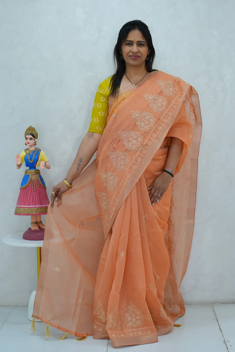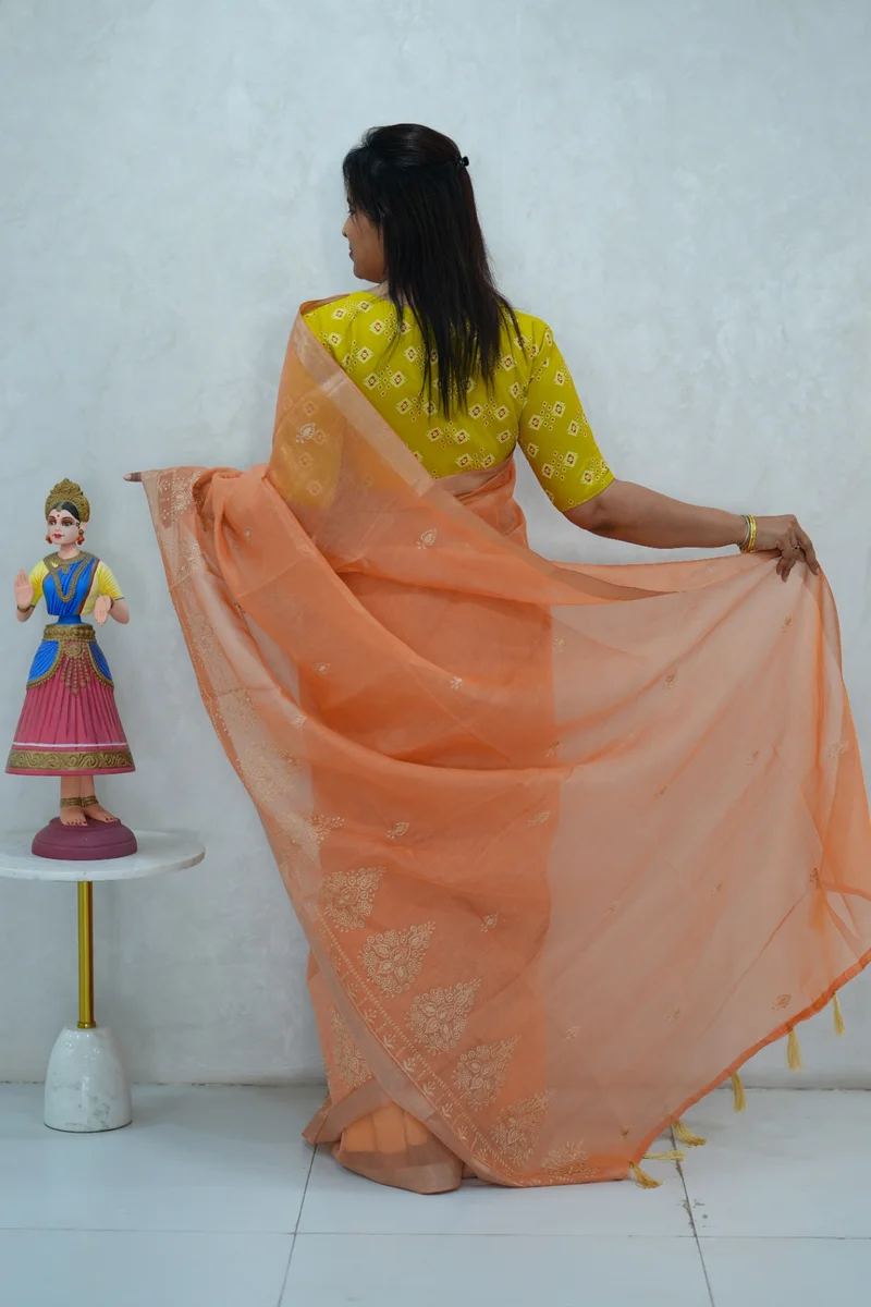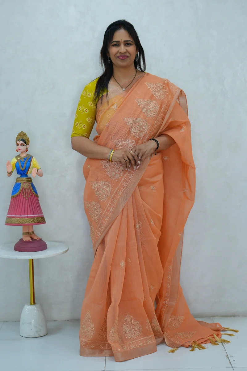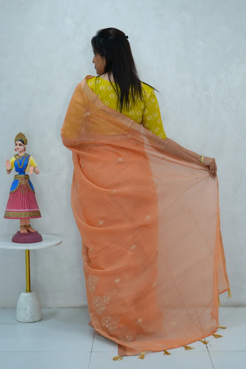 Description: Cotton Silk saree peachish orange with thread buttas, zari border and floral design embroidery work border with blouse 1. Material: Cotton Silk 2. Blouse: attached