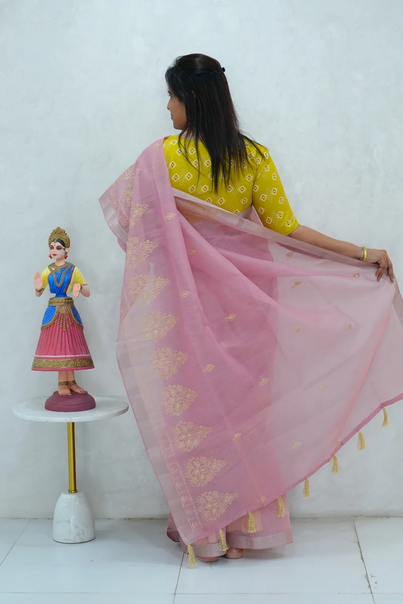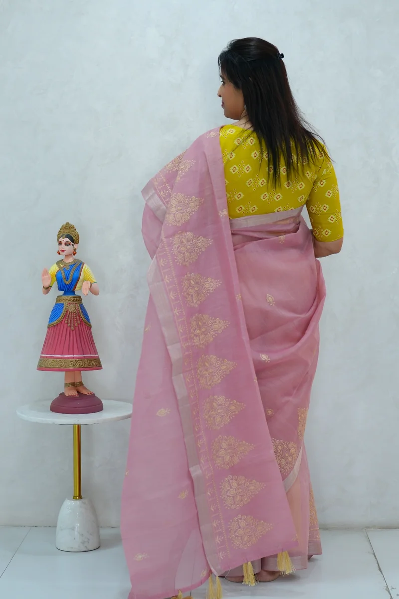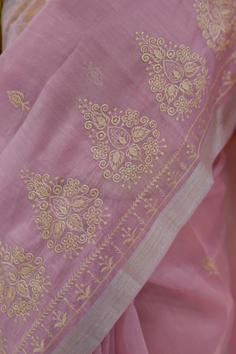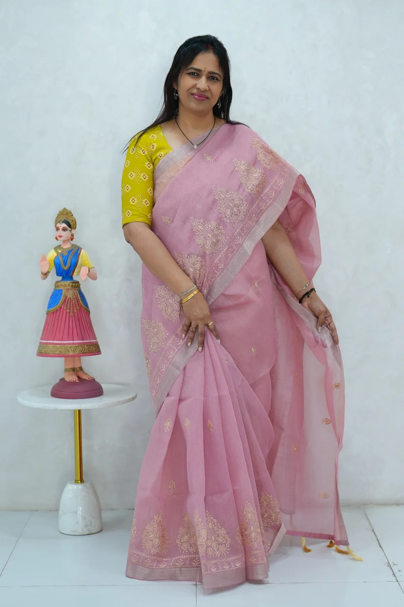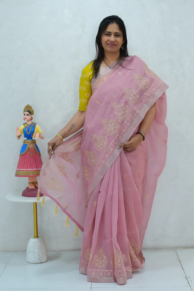 Description: Cotton Silk saree pink with thread buttas, zari border and floral design embroidery work border with blouse 1. Material: Cotton Silk 2. Blouse: attached