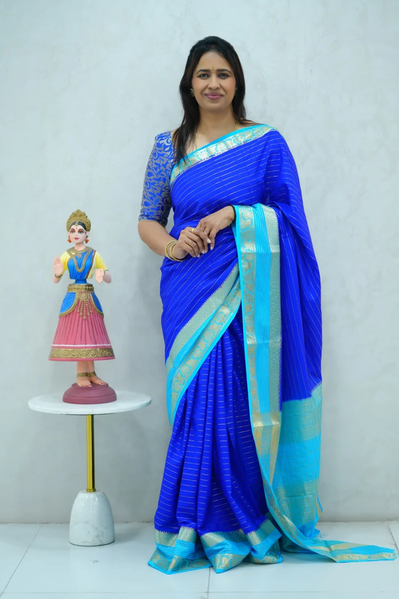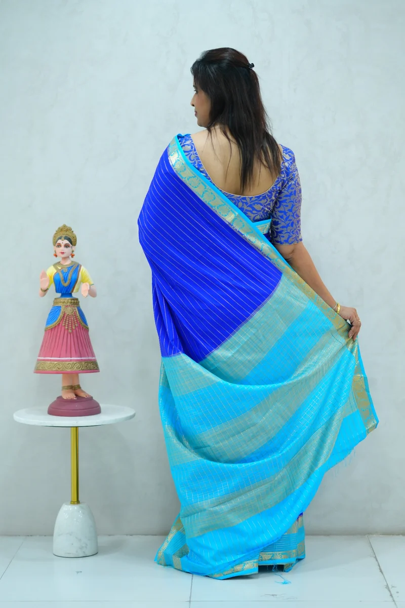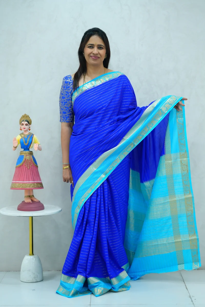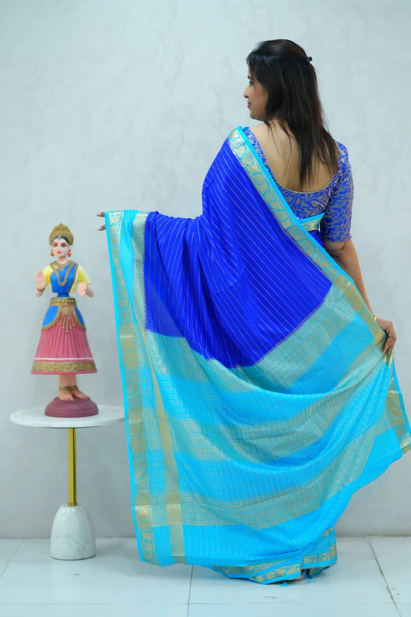 Description: Beautiful crepe silk saree in bright and light blue combination with all over zari weaving and contrast gap border, pallu and blouse 1. Material: Crepe Silk 2. Blouse: attached