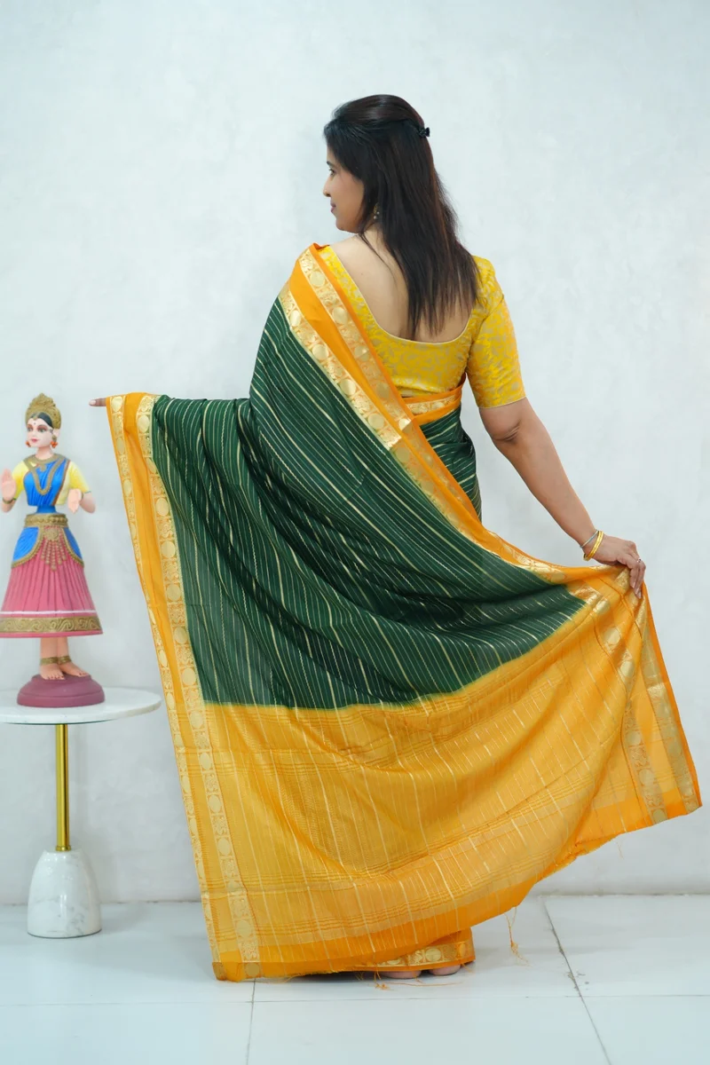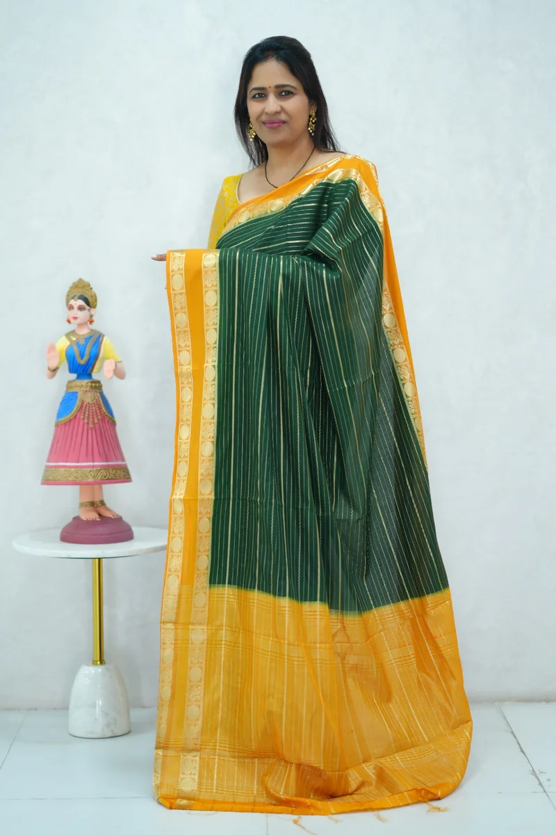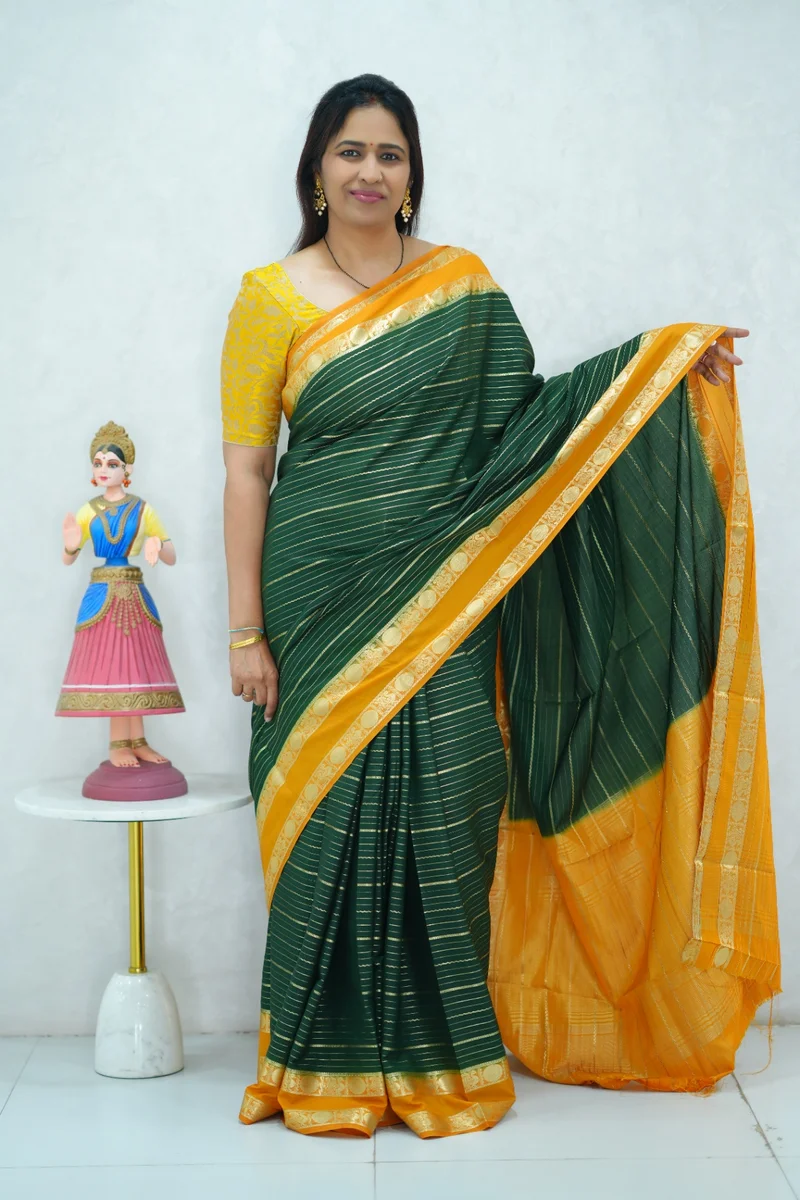 Description: Beautiful crepe silk saree in green and mustard yellow combination with all over zari weaving and contrast gap border, pallu and blouse 1. Material: Crepe Silk 2. Blouse: attached