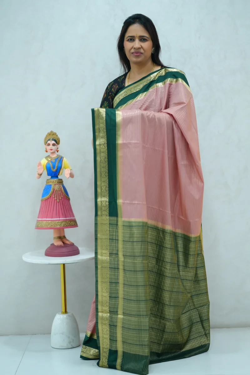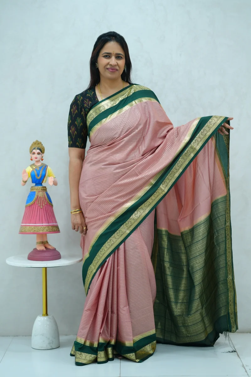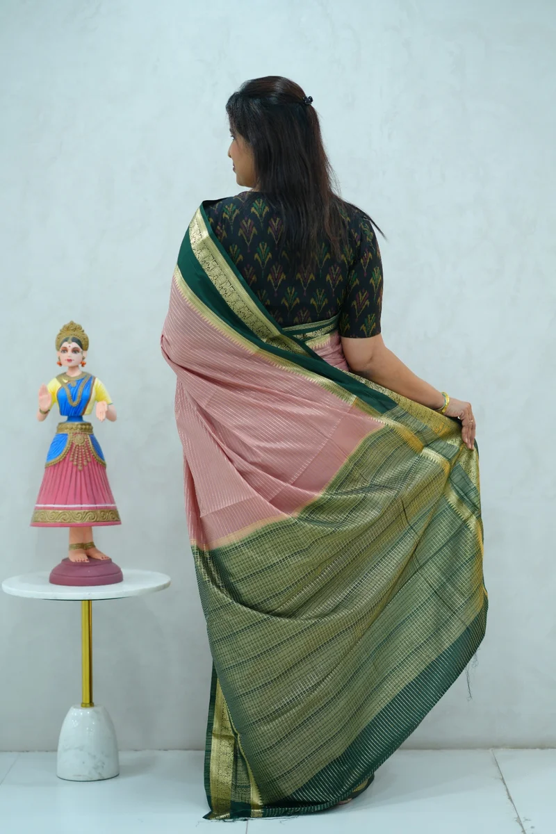 Description: Beautiful crepe silk saree in onion pink and green combination with all over zari weaving and contrast gap border, pallu and blouse 1. Material: Crepe Silk 2. Blouse: attached