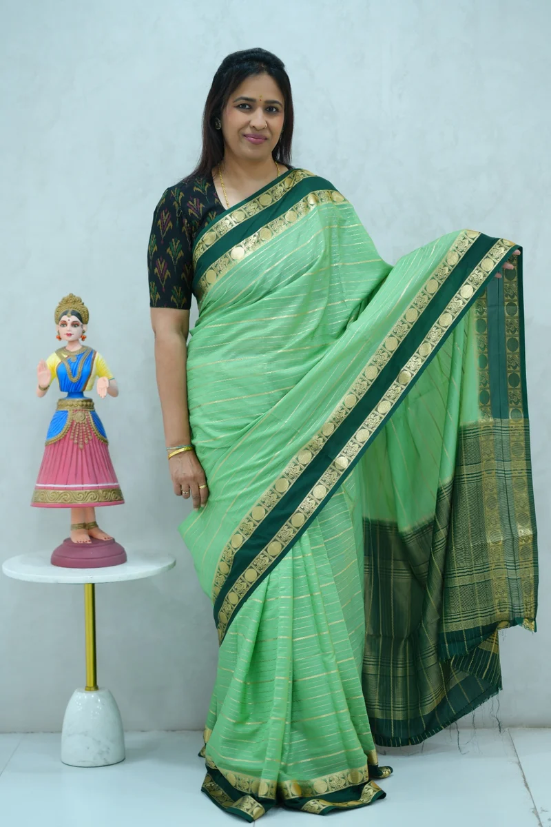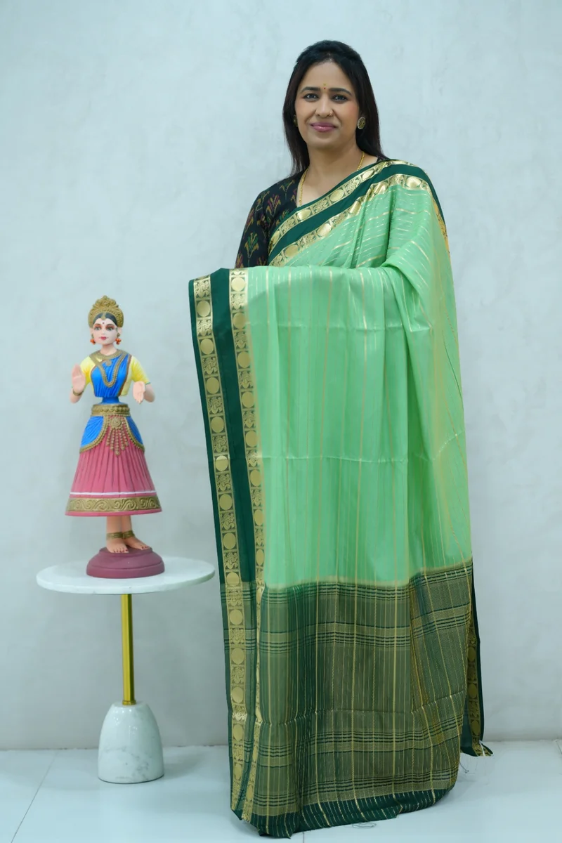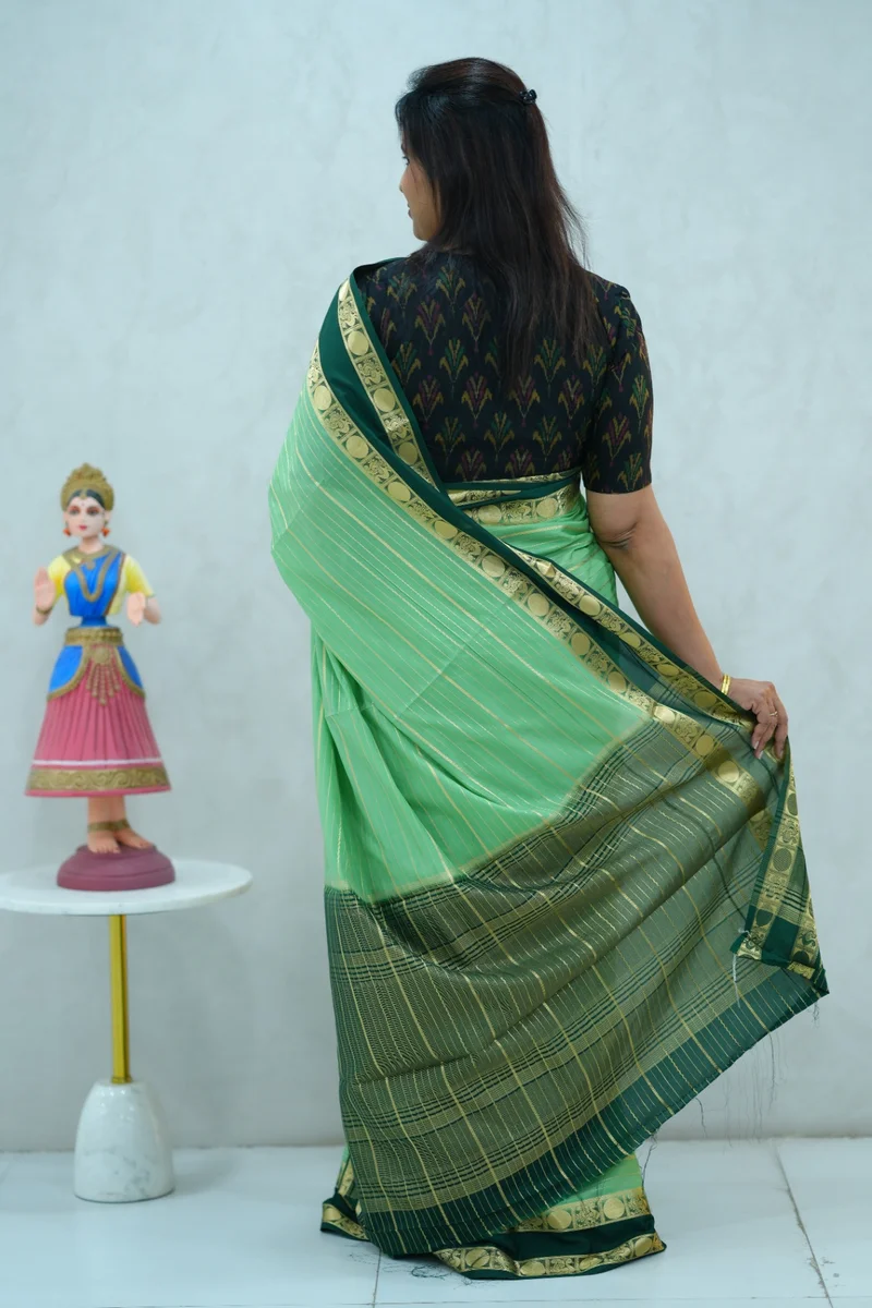 Description: Beautiful crepe silk saree in pastel green and dark green combination with all over zari weaving and contrast gap border, pallu and blouse 1. Material: Crepe Silk 2. Blouse: attached