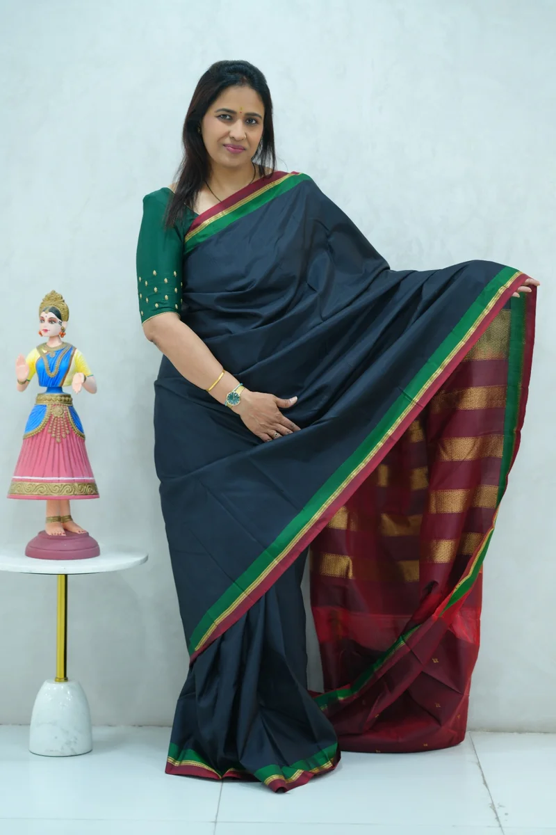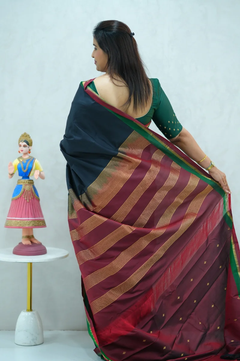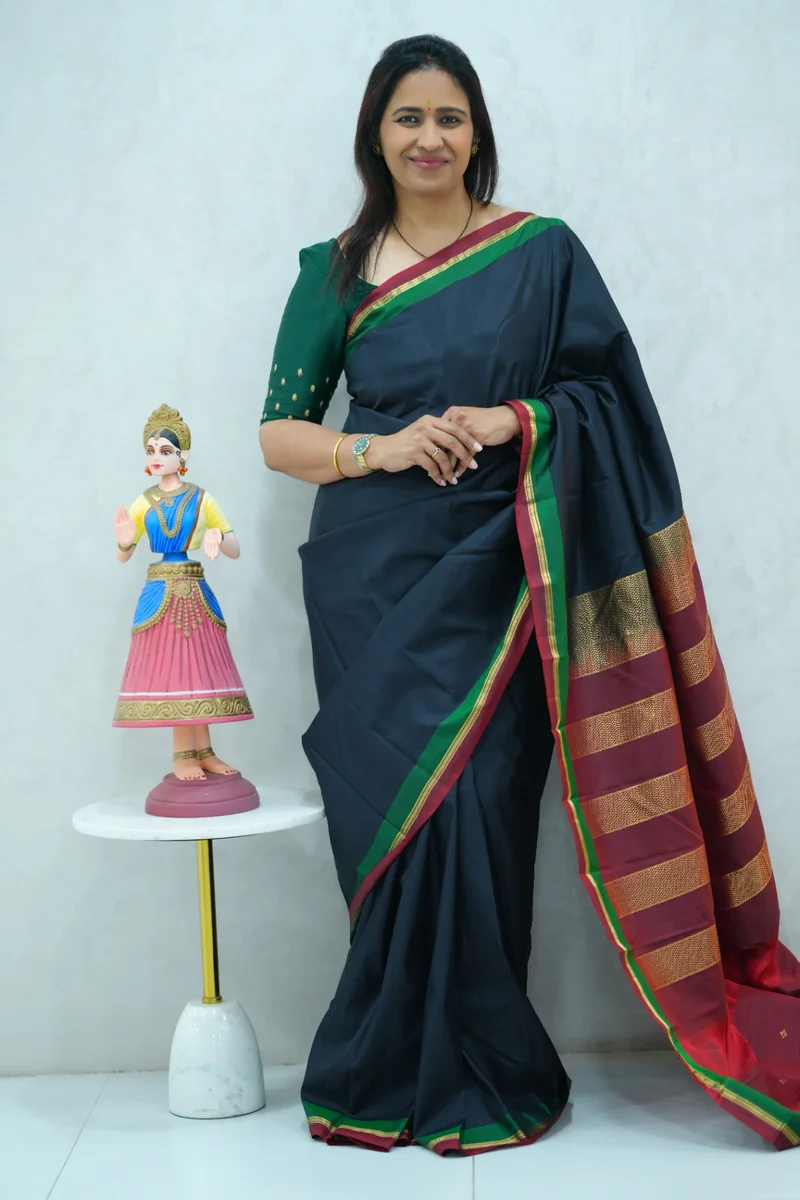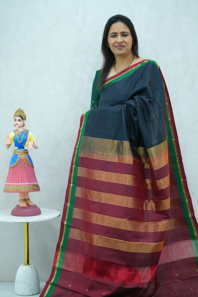 Description: Pure Kanchi Arani Silk Saree black colour with contrast green and red zari border with rich zari woven pallu with contrast zari woven blouse 1. Material: Pure Kanchi Arani Silk Saree 2. Blouse: attached