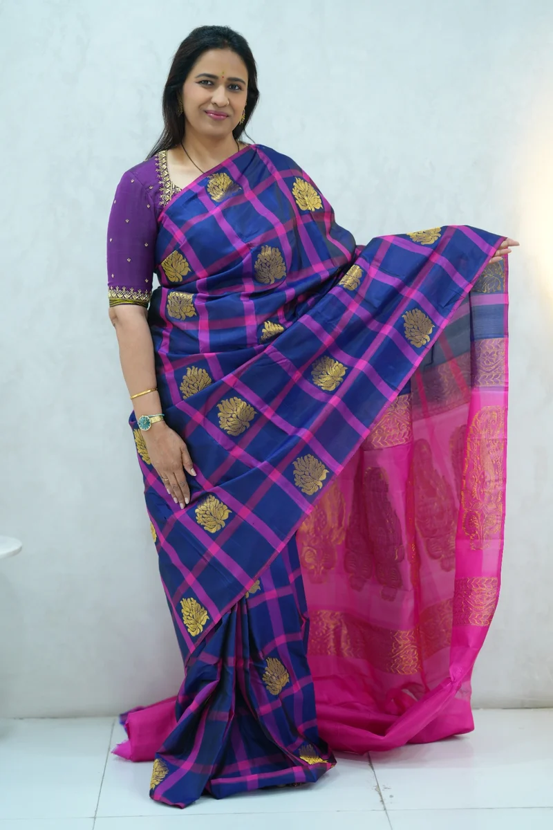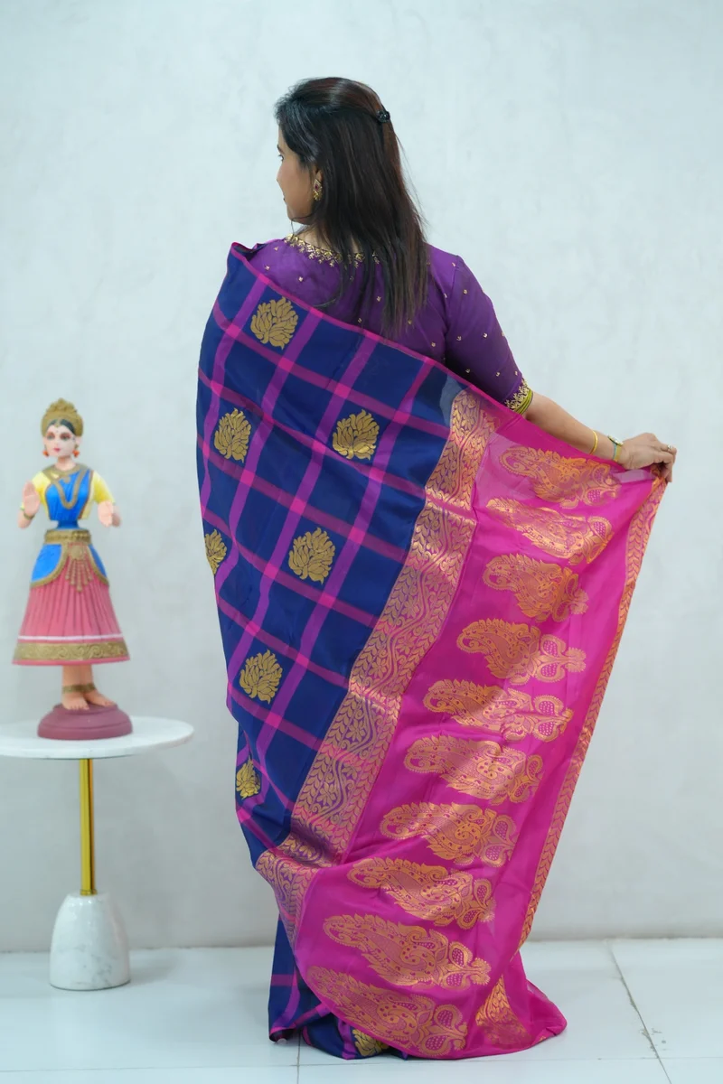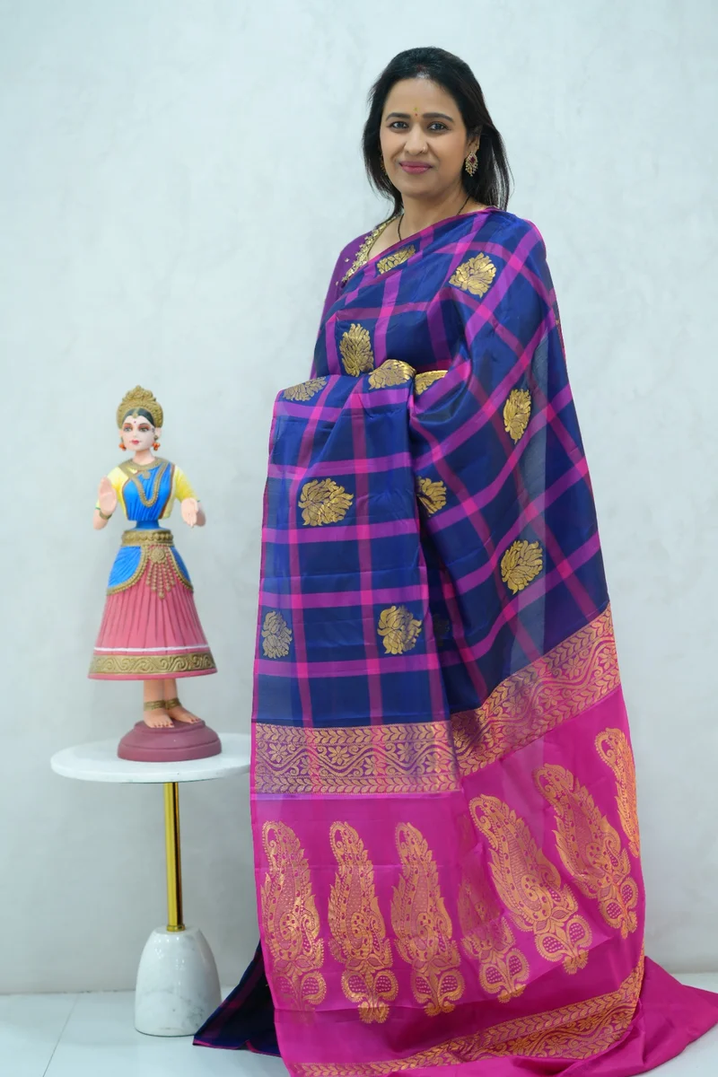 Description: Pure Kanchi Arani Silk Saree borderless pattern in blue & pink traditional large, checked pattern with big zari woven buttas and rich zari woven pallu with contrast blouse 1. Material: Pure Kanchi Arani Silk Saree 2. Blouse: attached