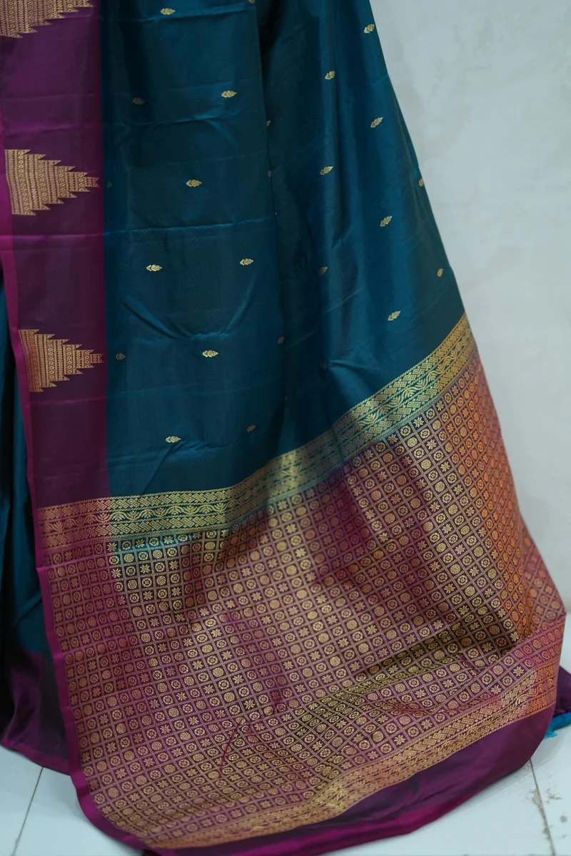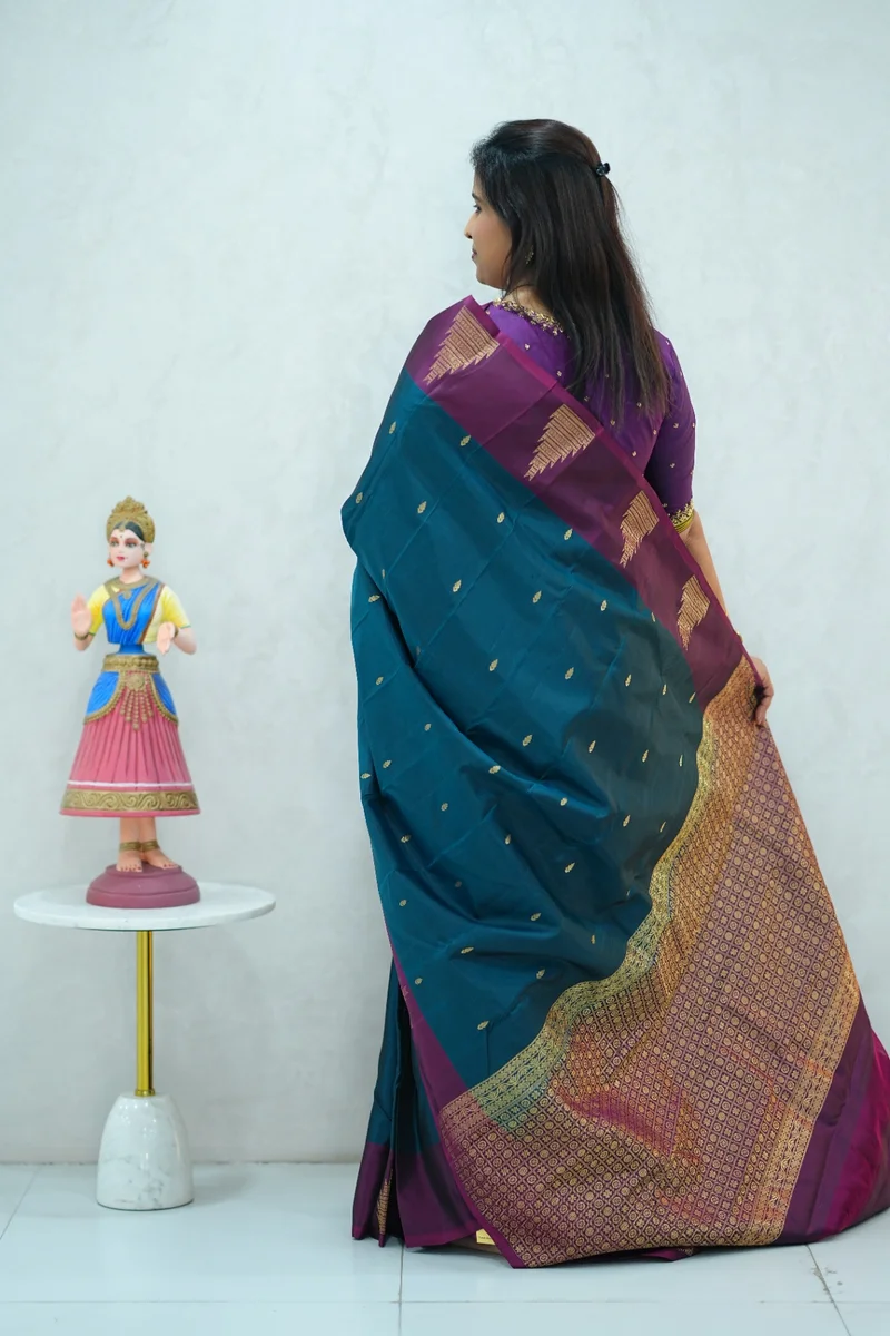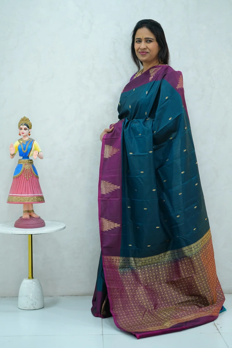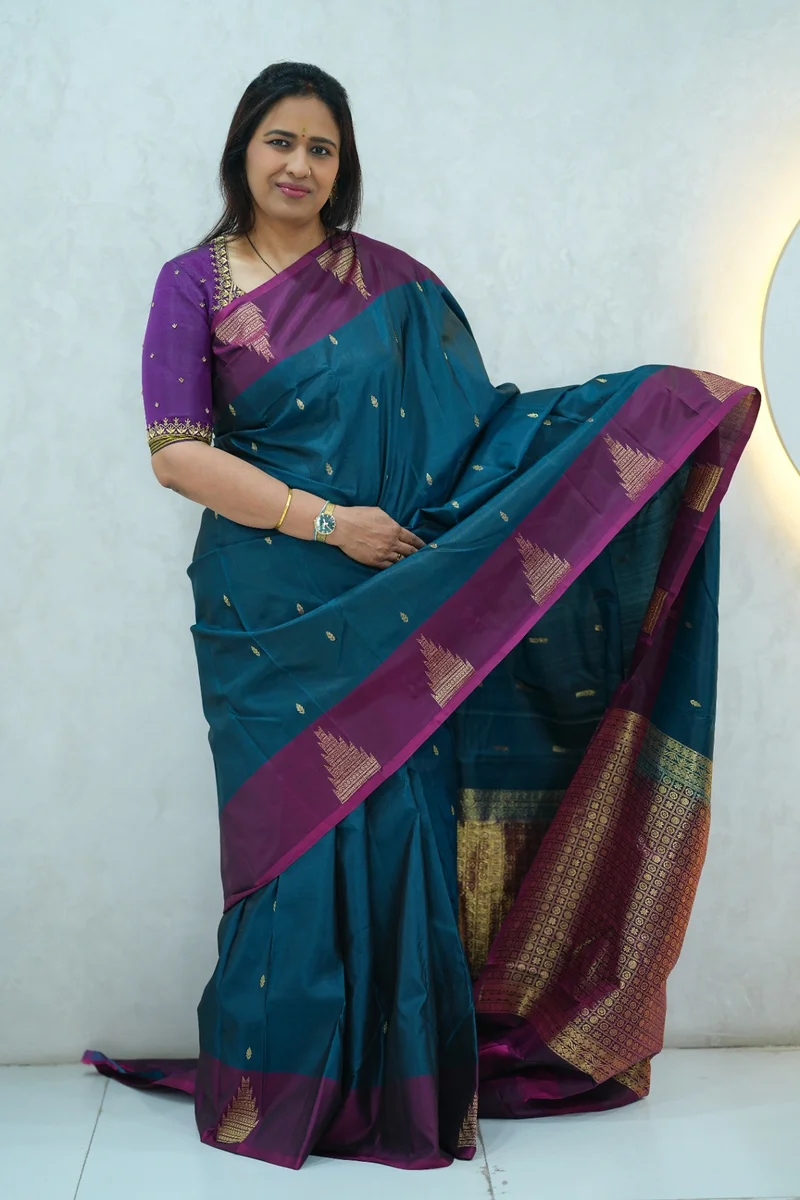 Description: Pure Kanchi Arani Silk Saree deep blue and magenta with contrast zari border with rich zari woven pallu with contrast blouse 1. Material: Pure Kanchi Arani Silk Saree 2. Blouse: attached