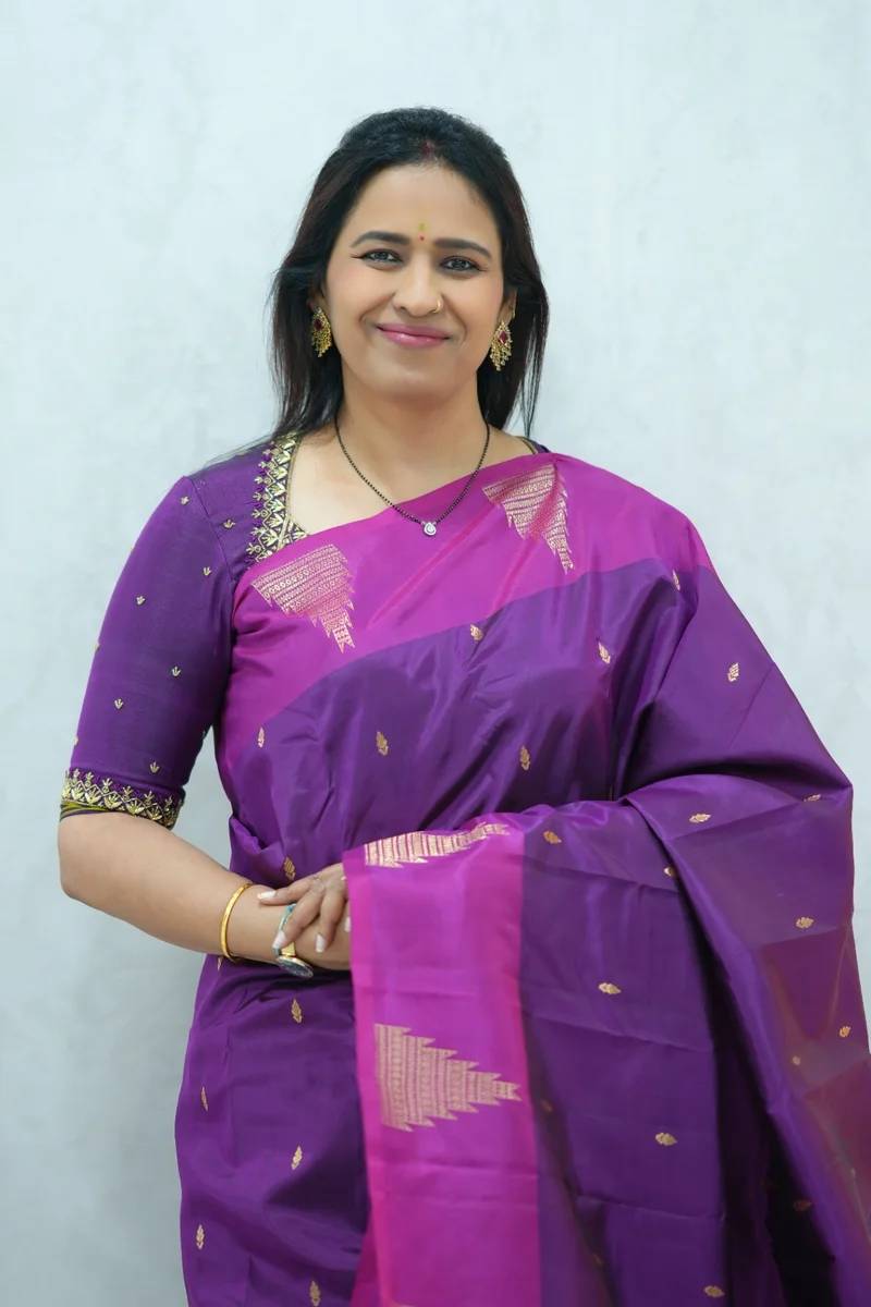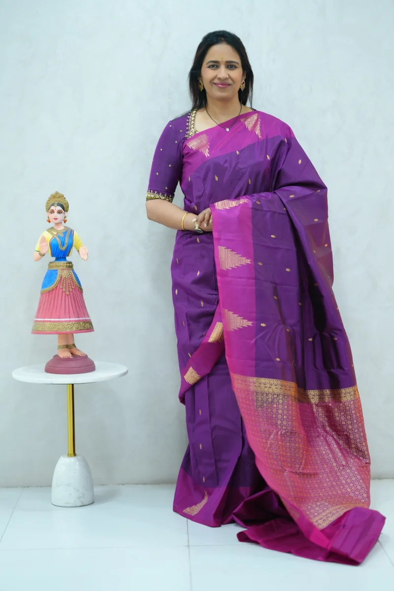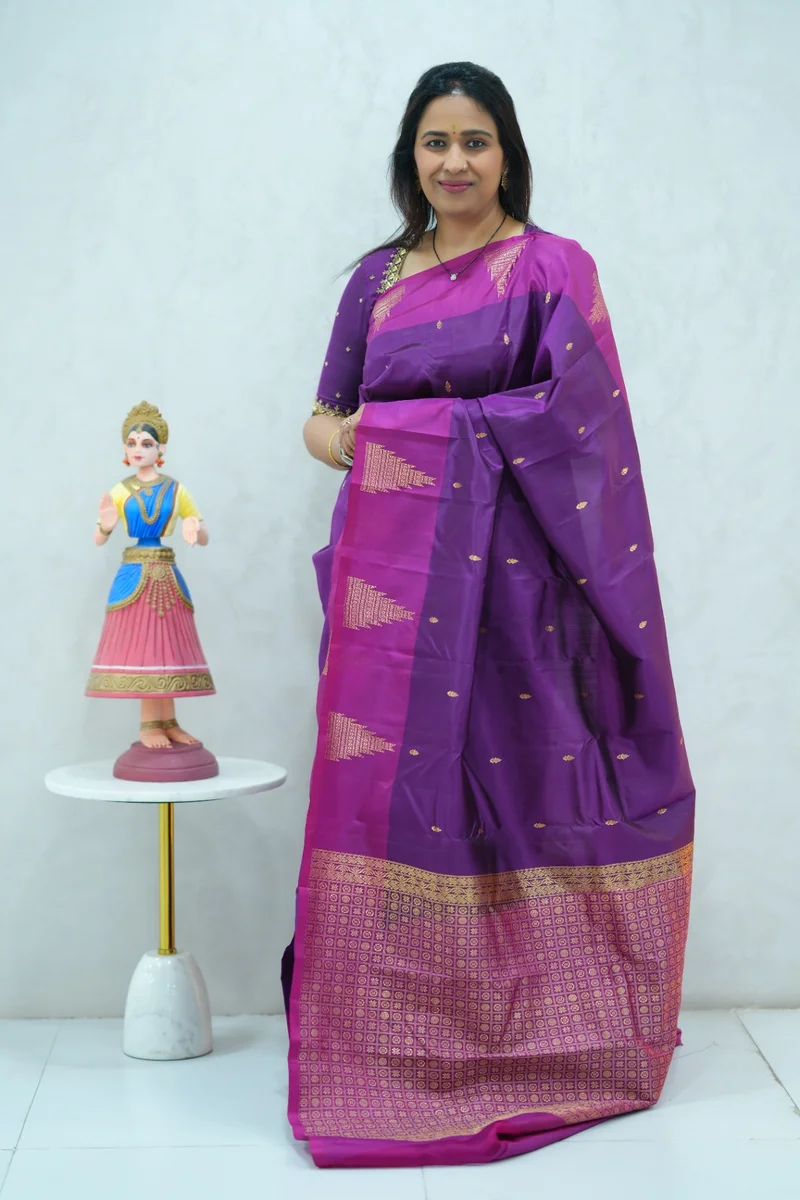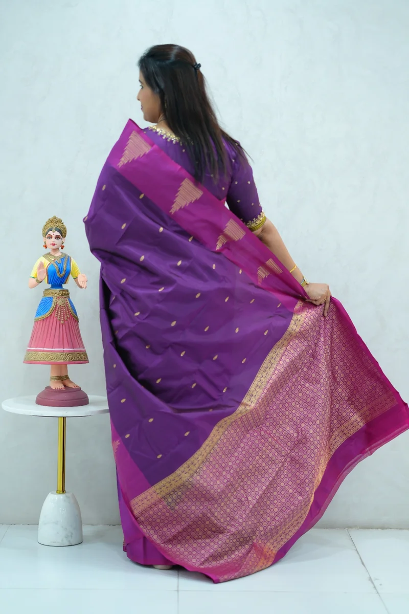 Description: Pure Kanchi Arani Silk Saree dual shade of purple & magenta colour with contrast vintage temple border with zari woven buttas and rich zari woven pallu with contrast blouse 1. Material: Pure Kanchi Arani Silk Saree 2. Blouse: attached