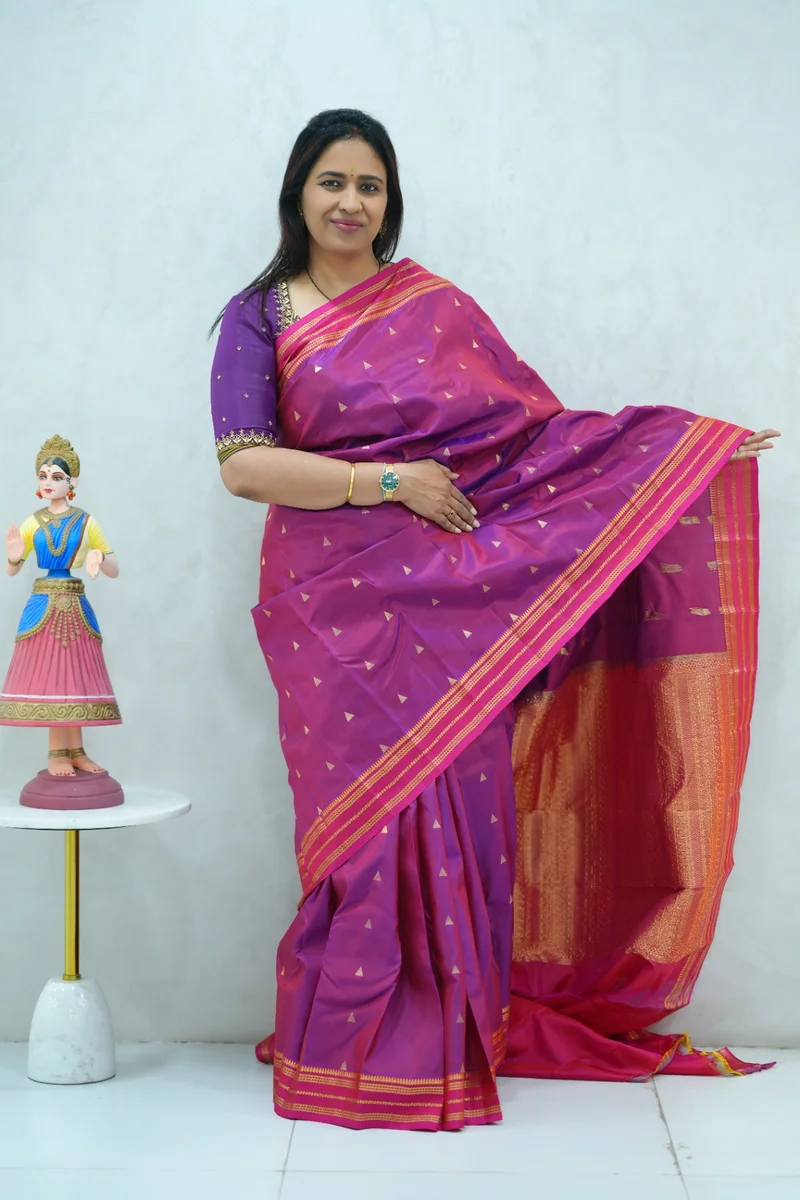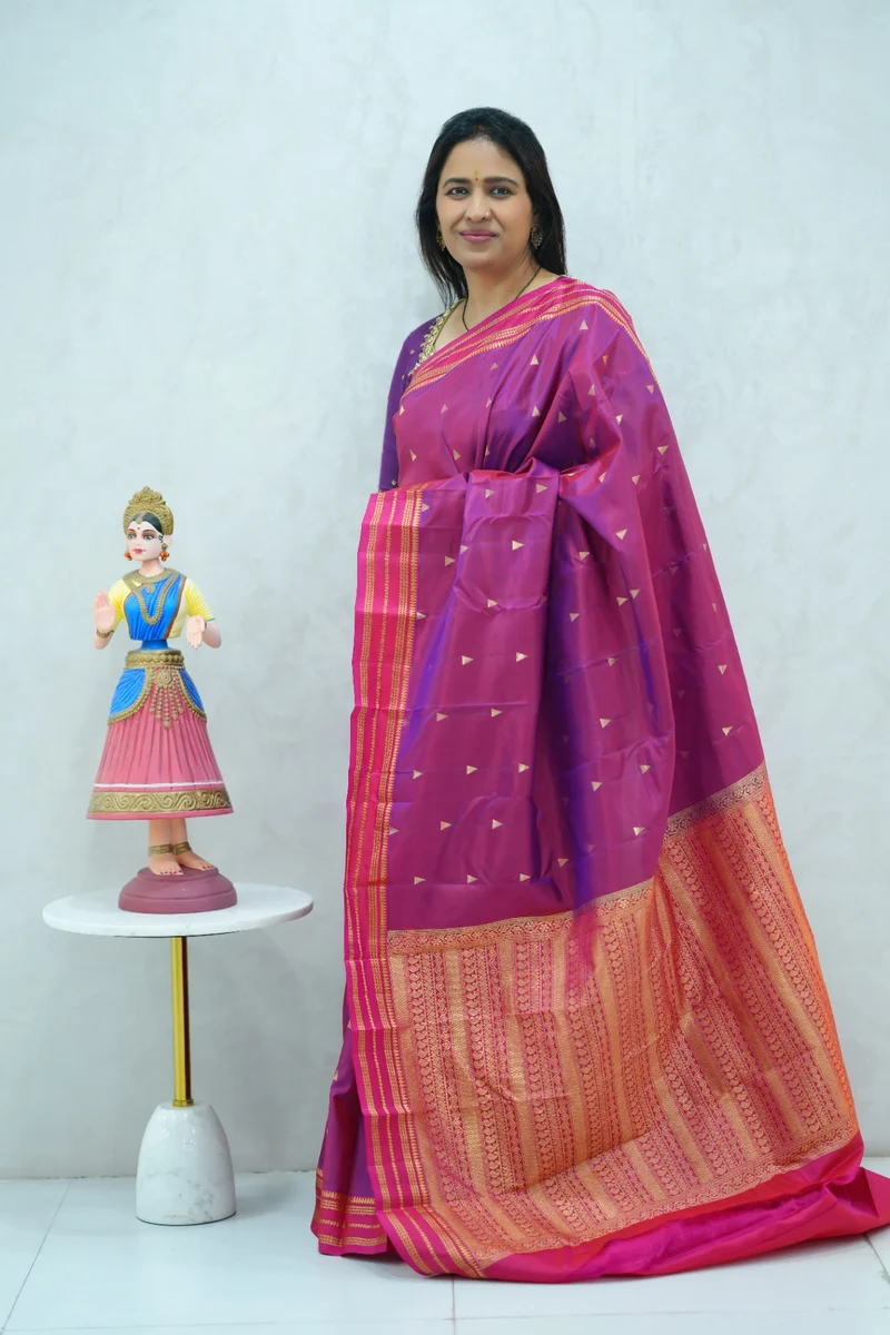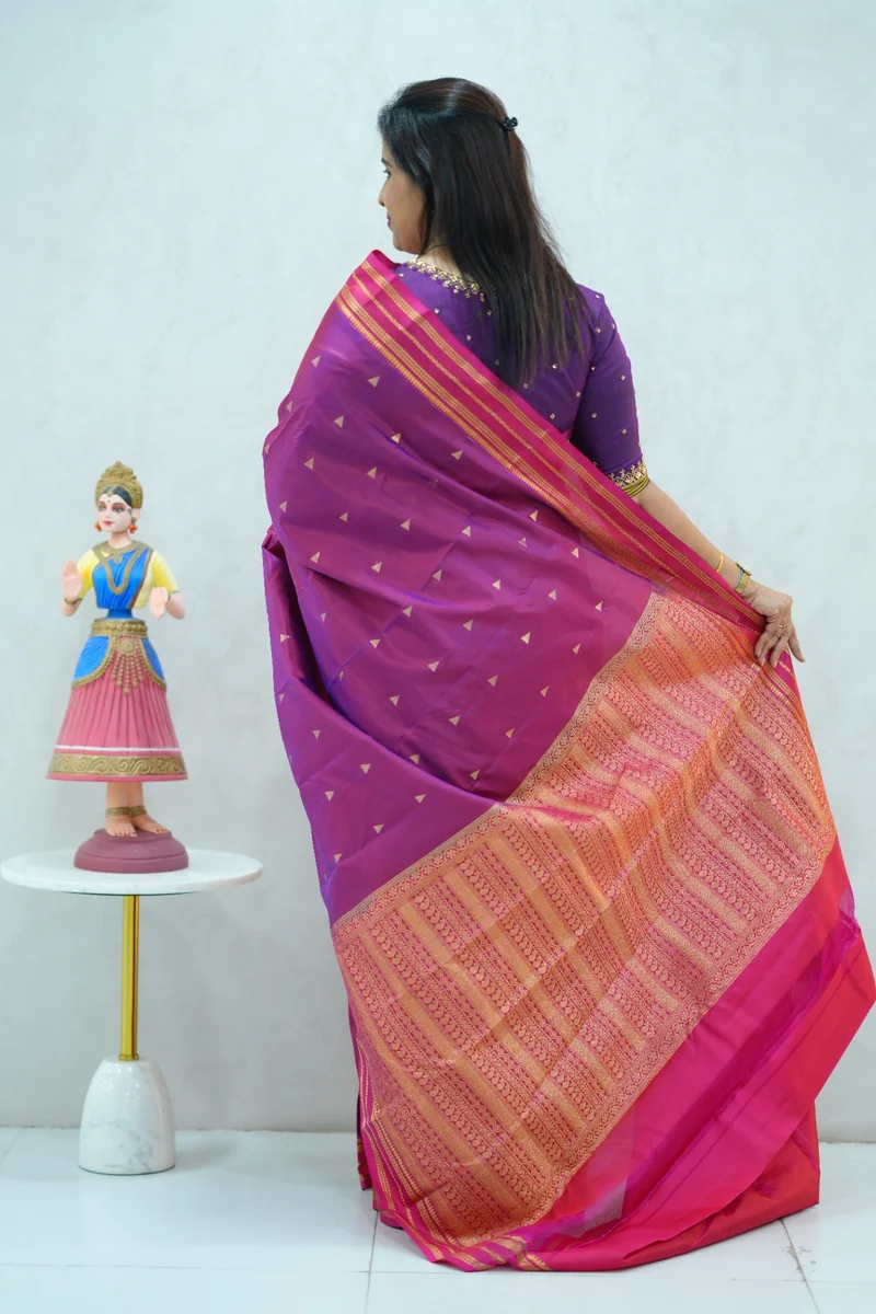 Description: Pure Kanchi Arani Silk Saree dual shade of violet and peach colour with contrast zari border with rich zari woven pallu with contrast blouse 1. Material: Pure Kanchi Arani Silk Saree 2. Blouse: attached