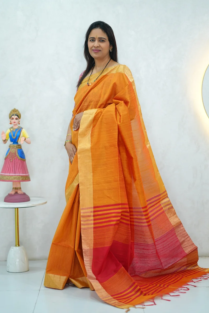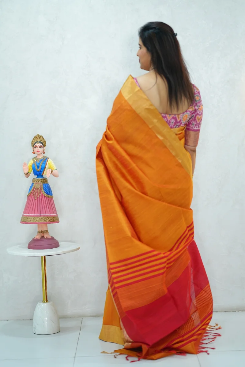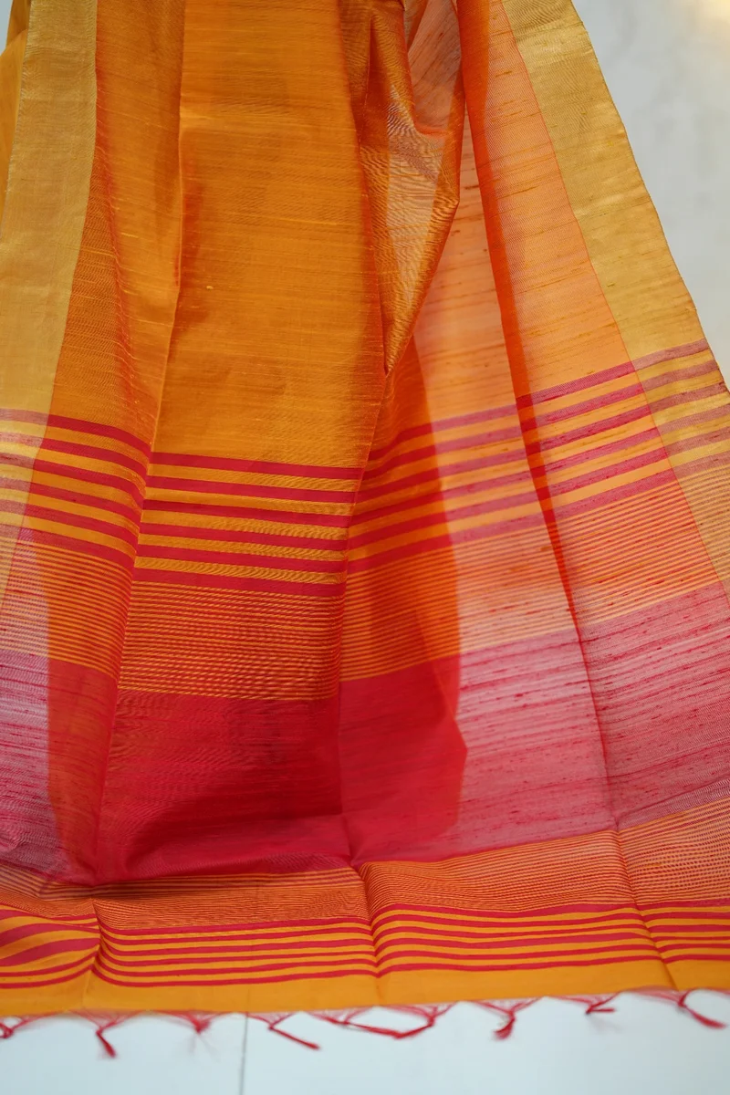 Description: Pure Raw Silk Saree in mustard yellow and pink colour combination with zari woven border and stripes pallu with contrast raw silk blouse 1. Material: Pure Raw Silk Saree 2. Blouse: attached