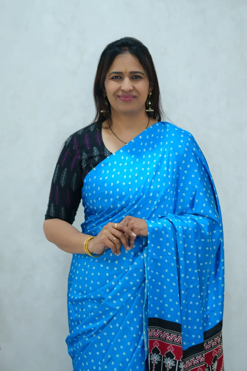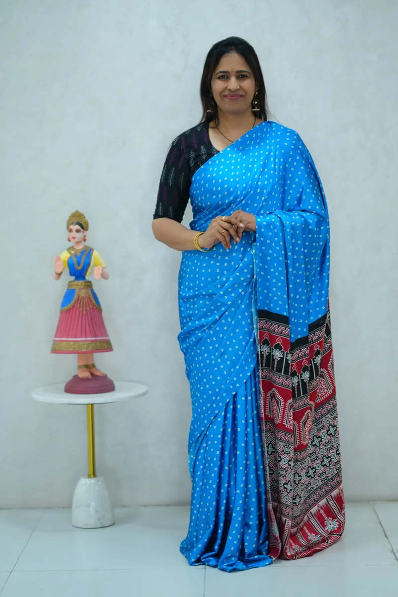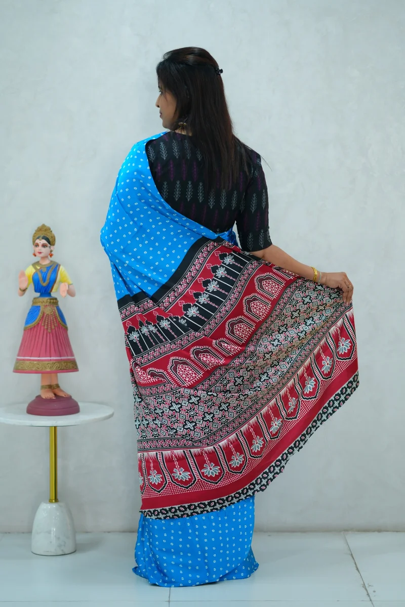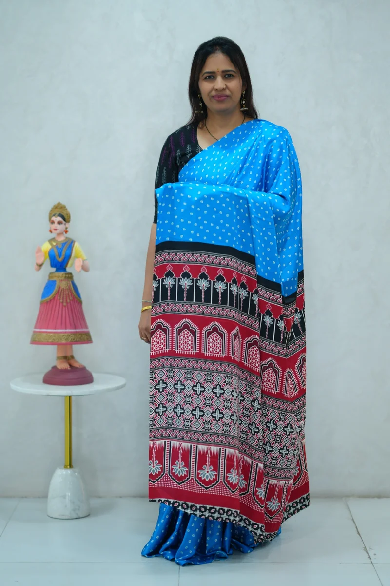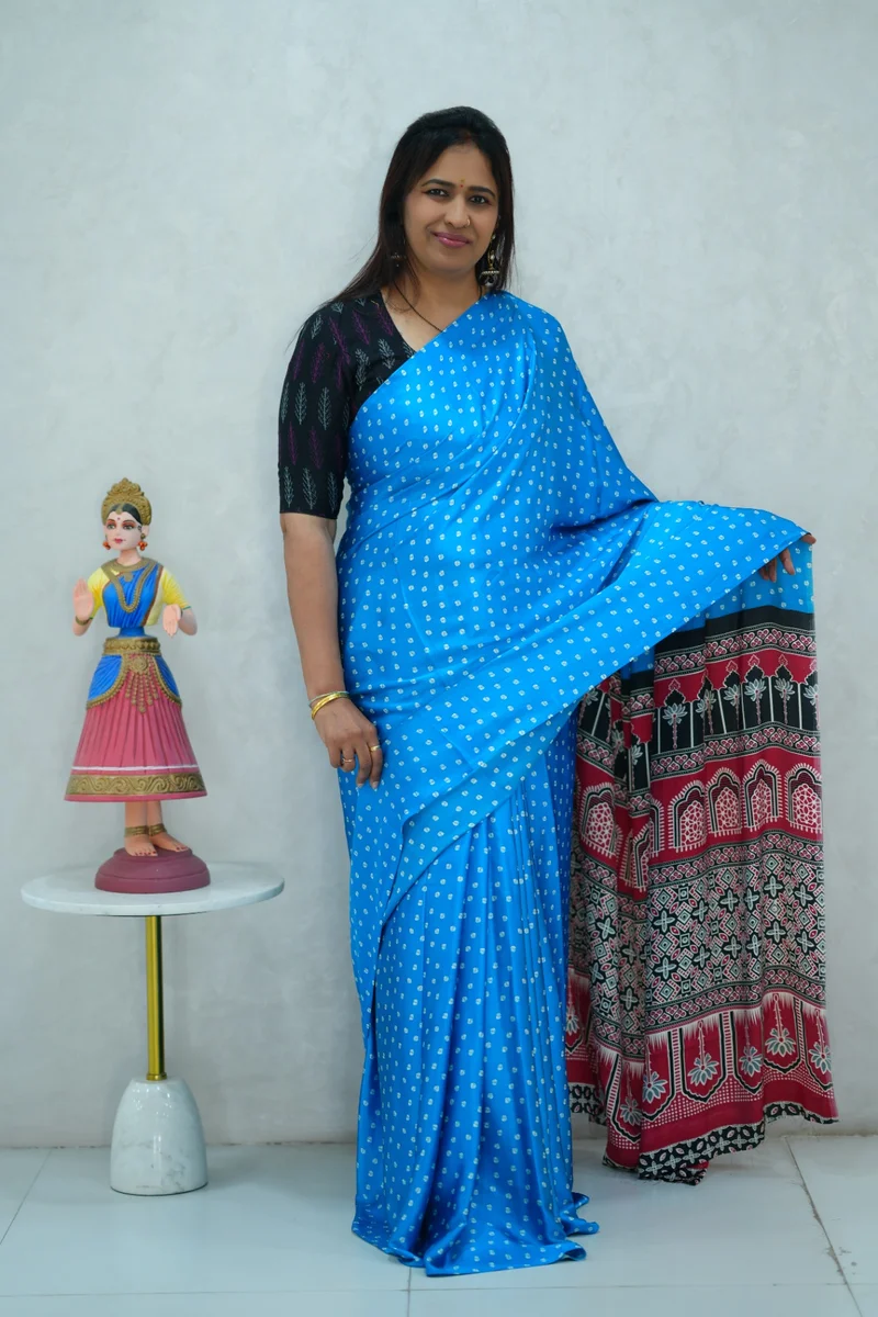 Description: Satin Silk Saree in blue and black with all over print with contrast ajrakh pallu and blouse 1. Material: Satin Silk 2. Blouse: attached