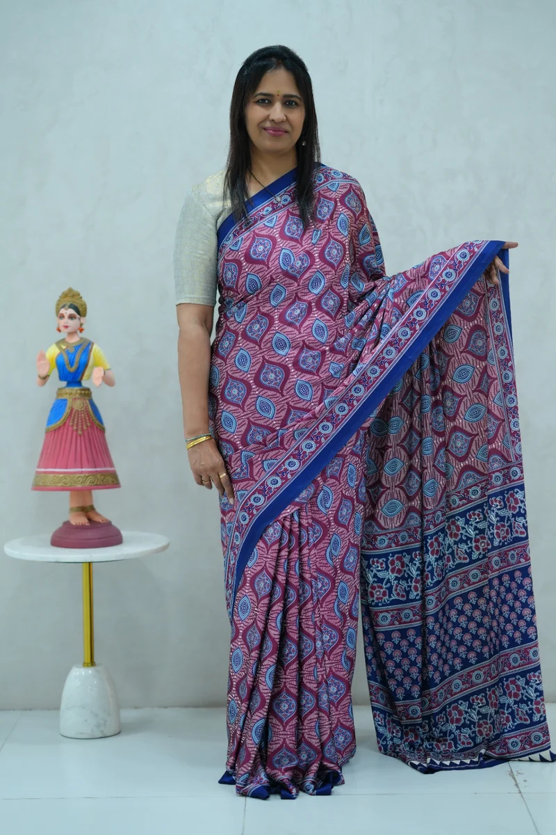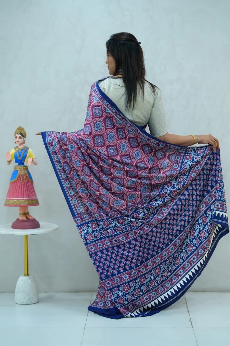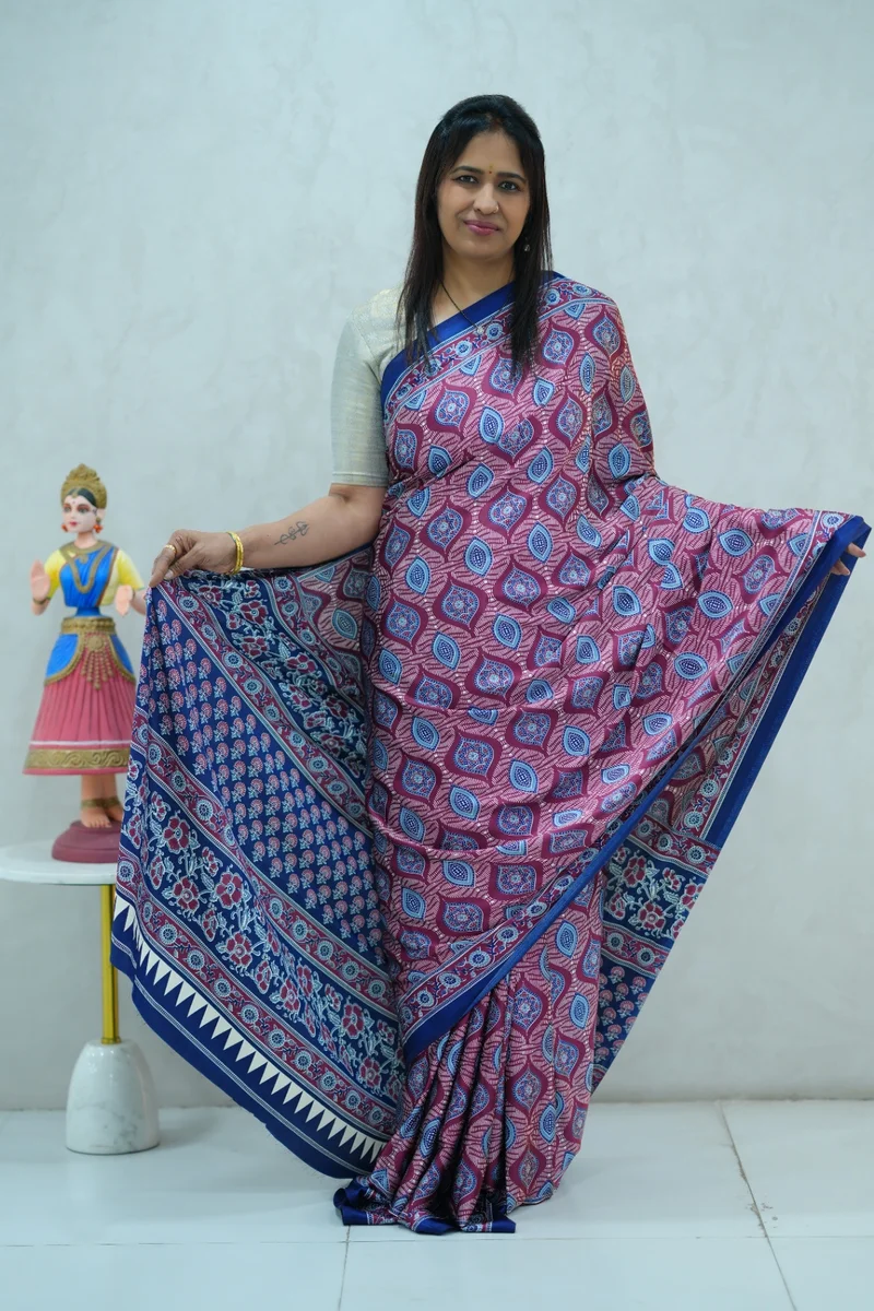 Description: Satin Silk Saree in jamuni shade and blue colour with beautiful ajrakh print all over with contrast pallu and blouse 1. Material: Satin Silk 2. Blouse: attached
