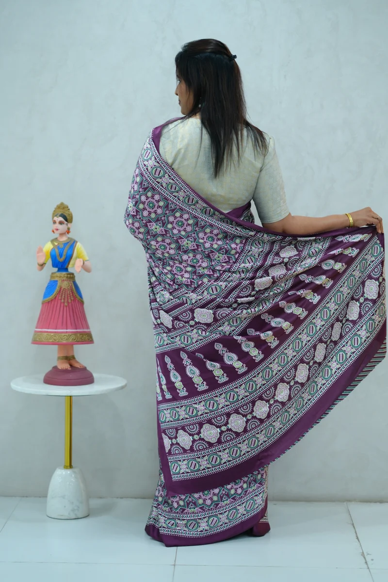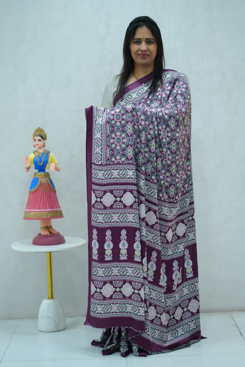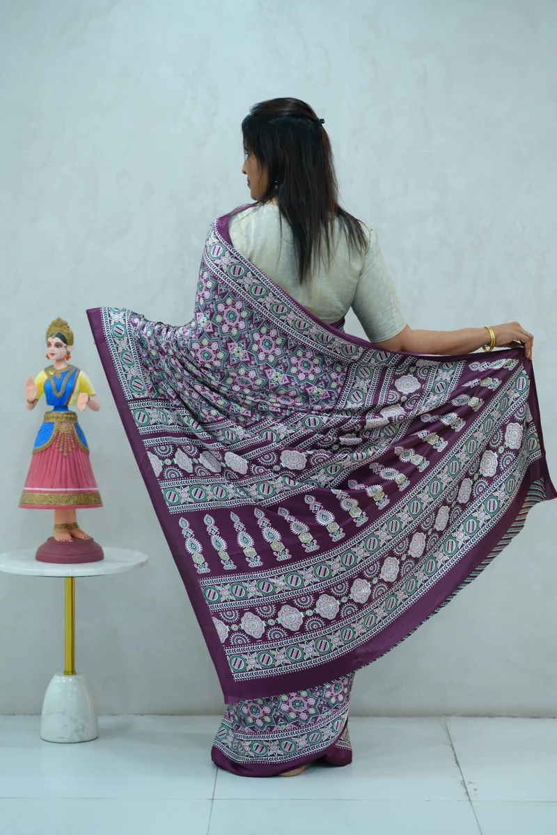 Description: Satin Silk Saree in jamuni shade with all over ajrakh print with ajrakh print pallu and blouse 1. Material: Satin Silk 2. Blouse: attached