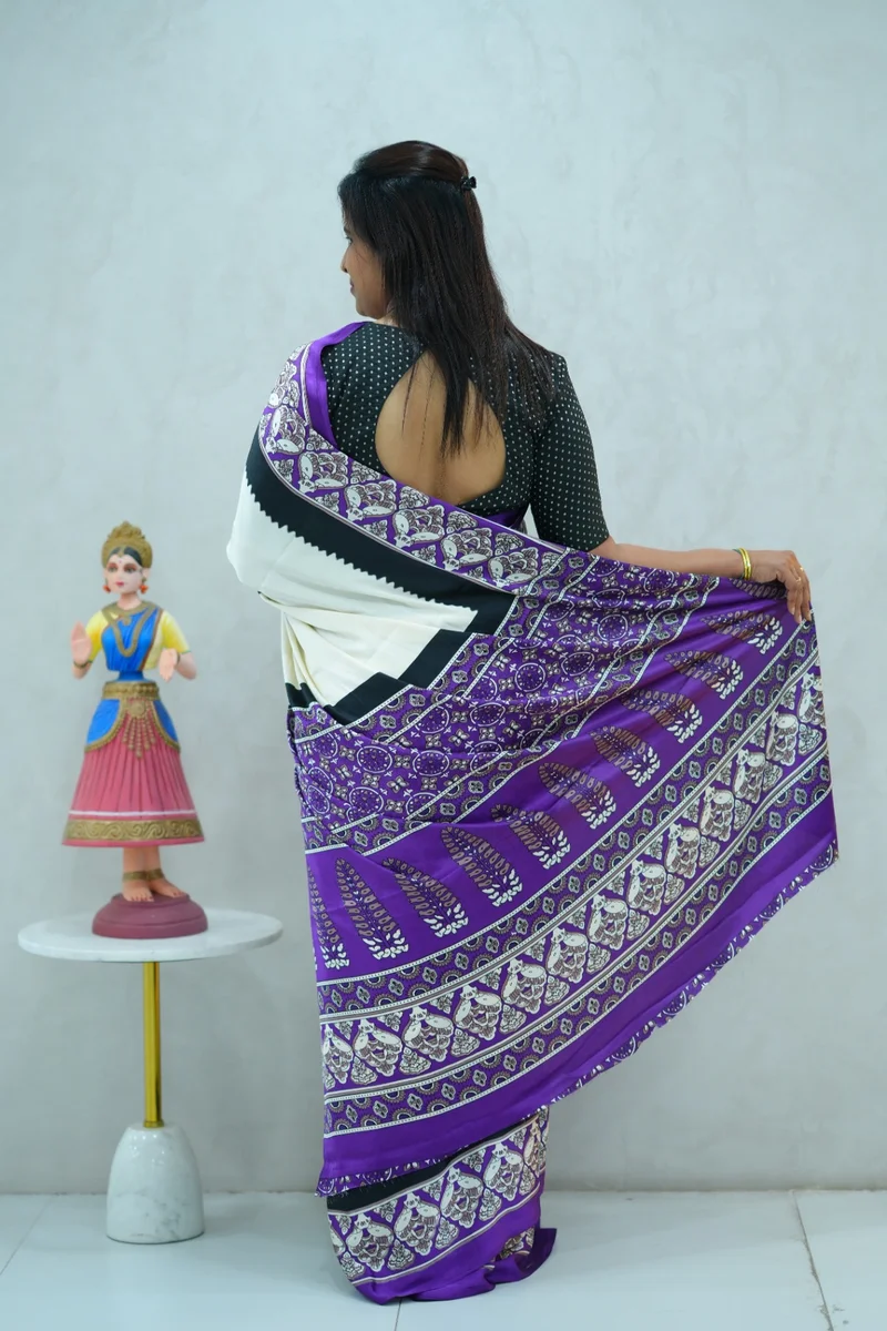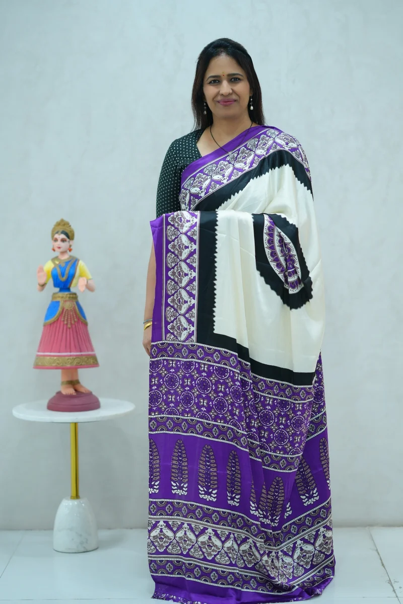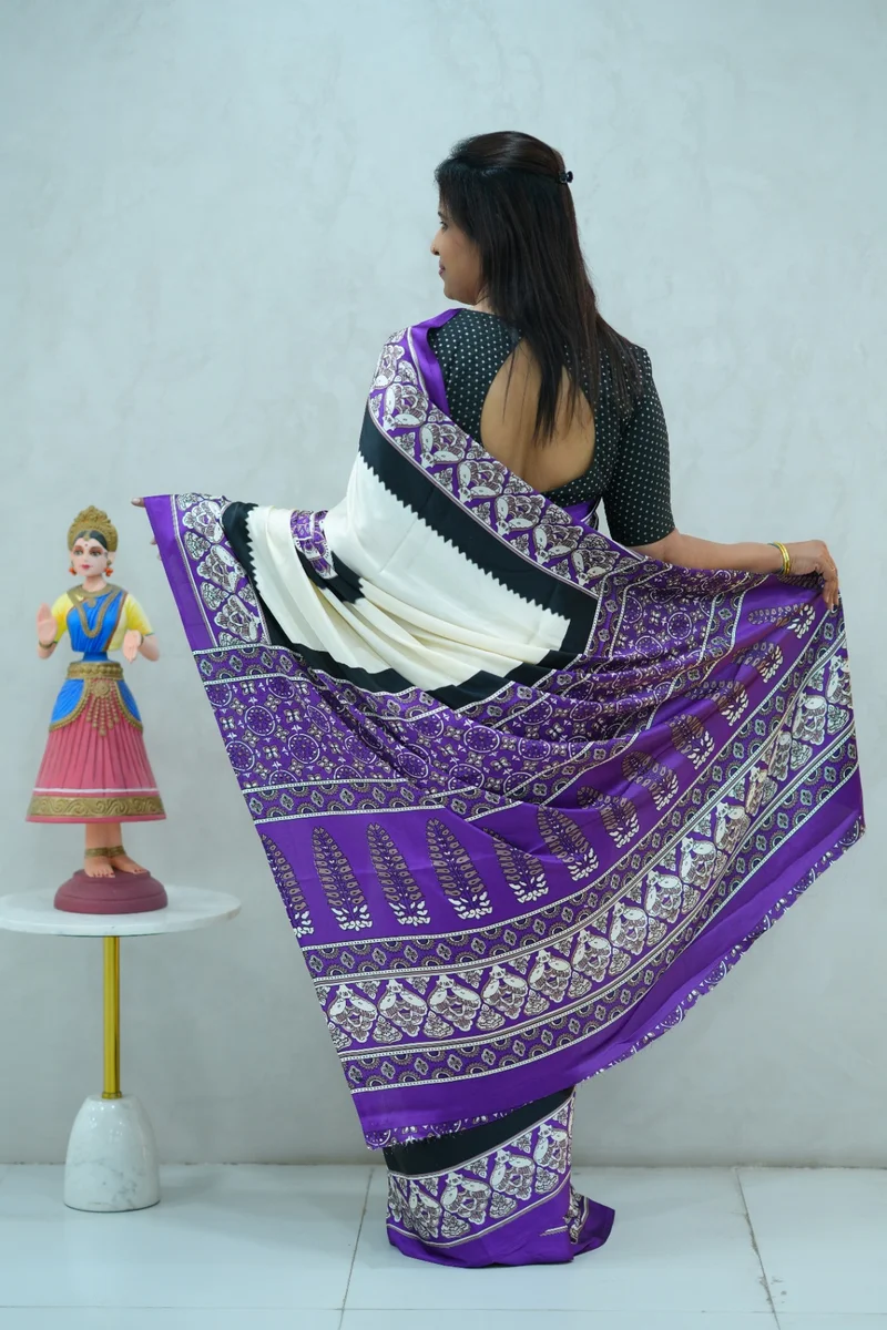 Description: Satin Silk Saree in violet, beige and black colour with beautiful print all over, printed border and pallu with contrast blouse 1. Material: Satin Silk 2. Blouse: attached