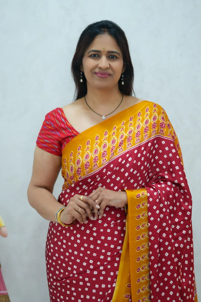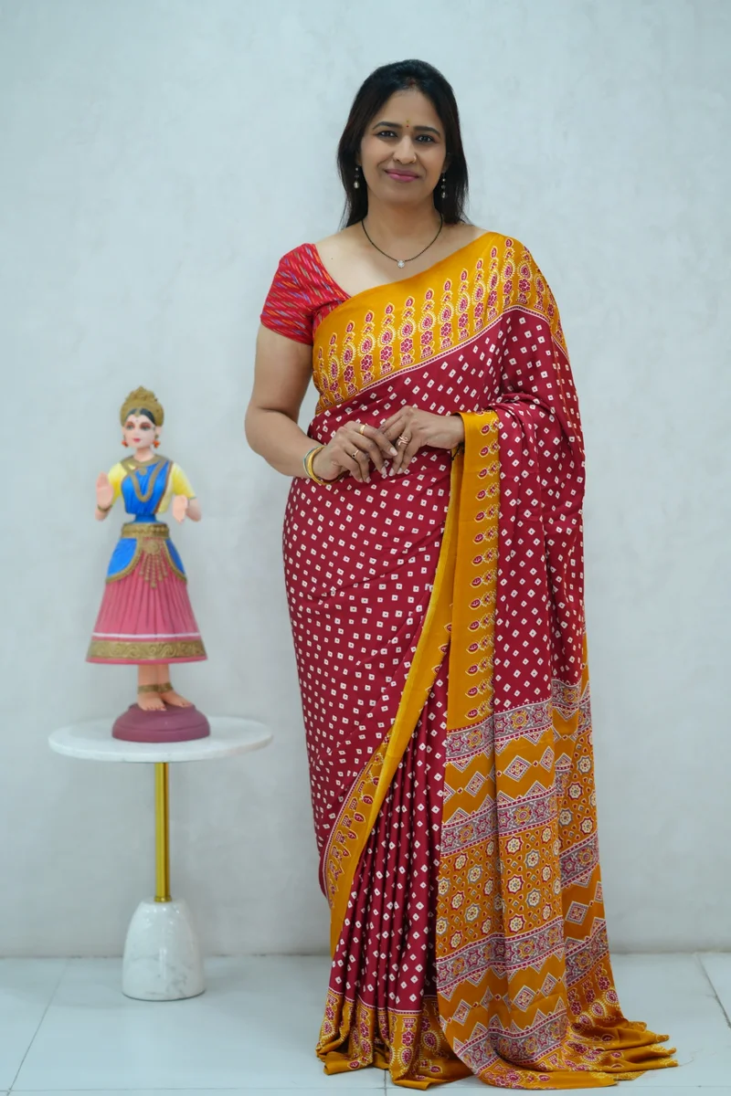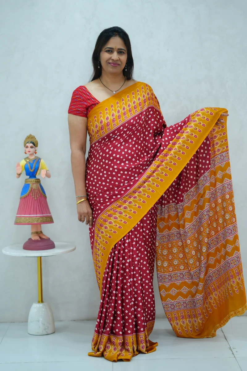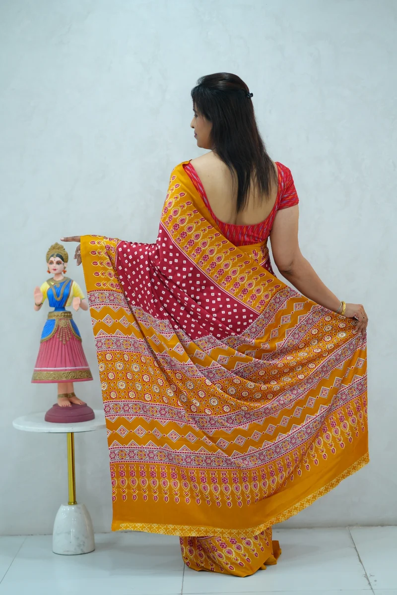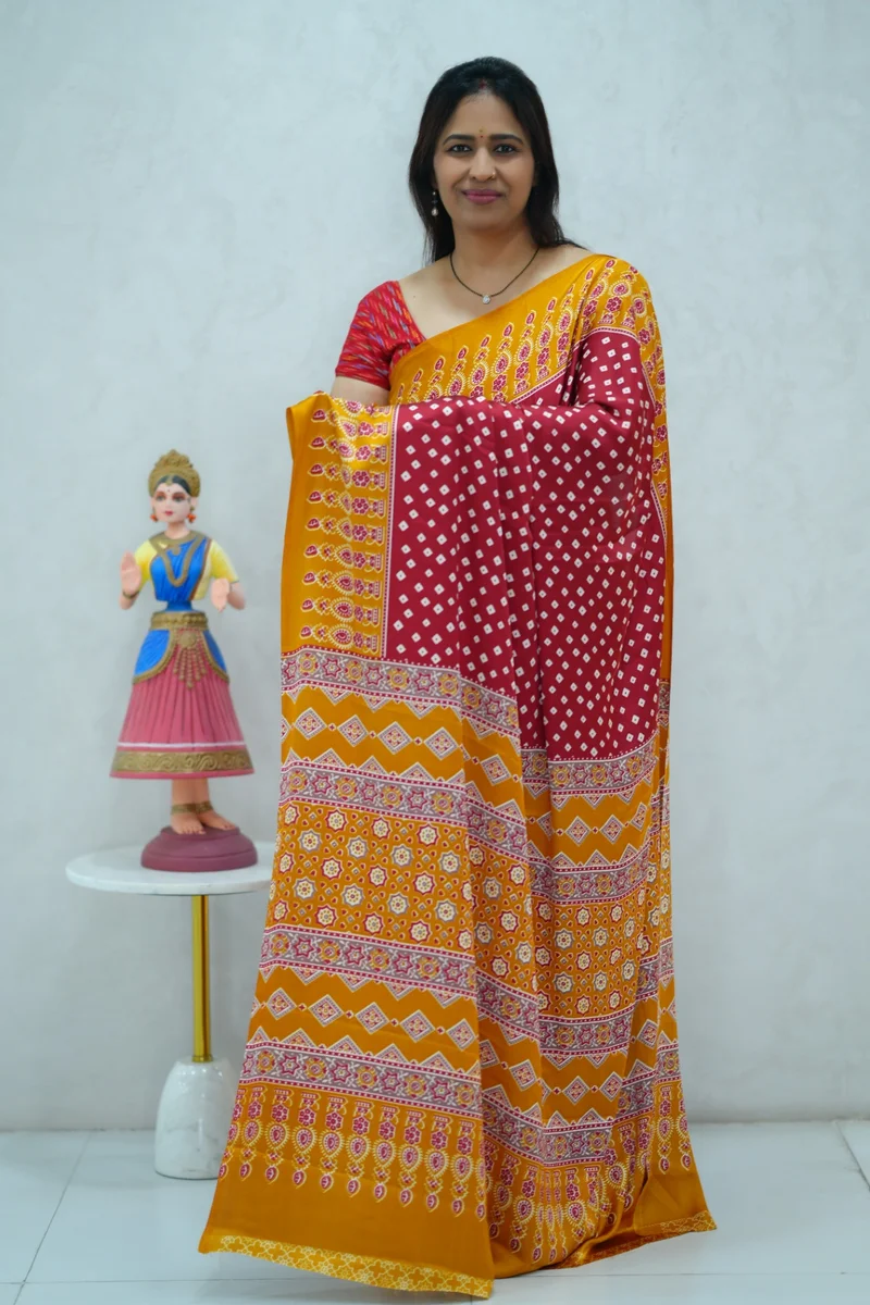 Description: Satin Silk Saree in yellow and red with beautiful ajrakh print all over with contrast pallu and blouse 1. Material: Satin Silk 2. Blouse: attached