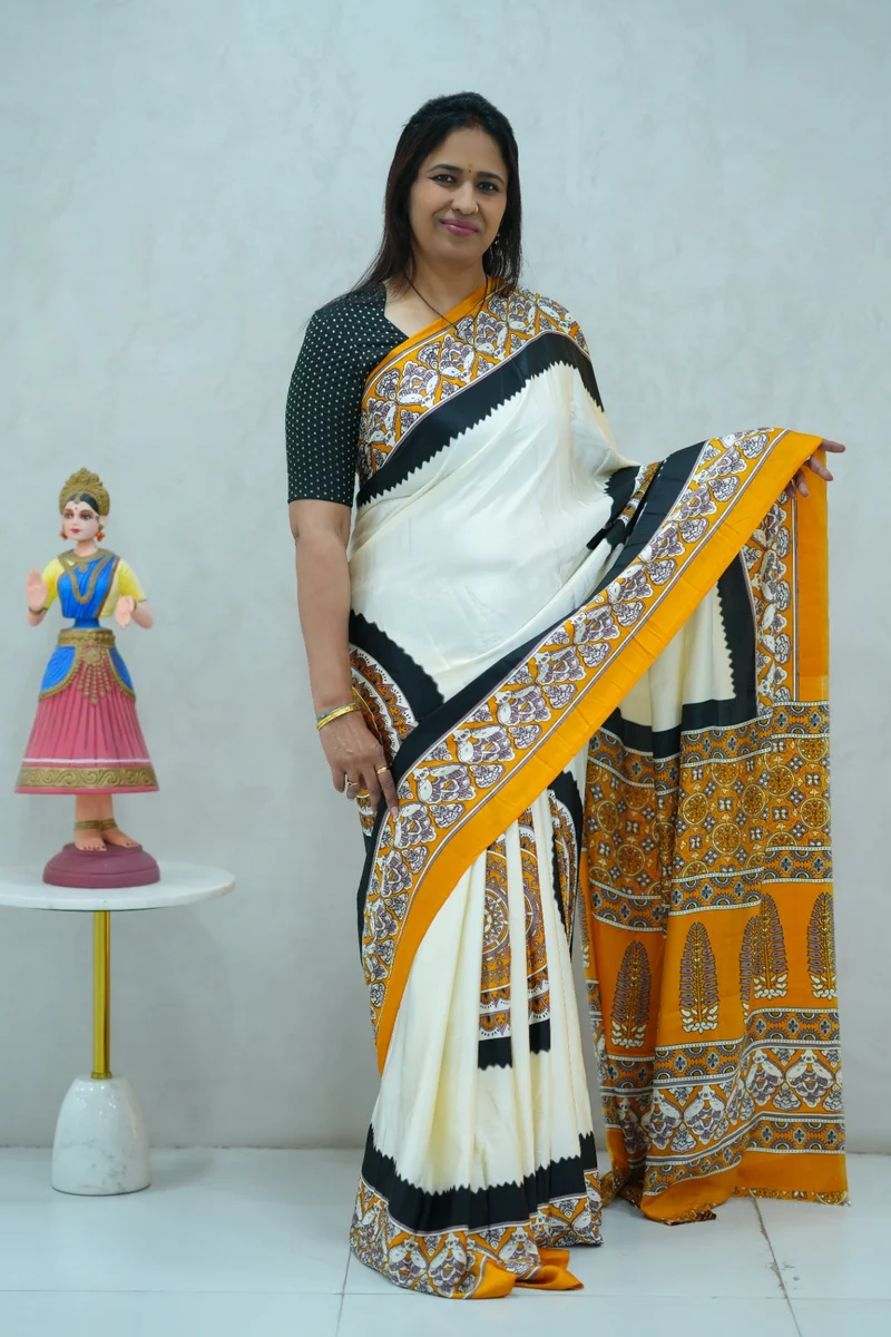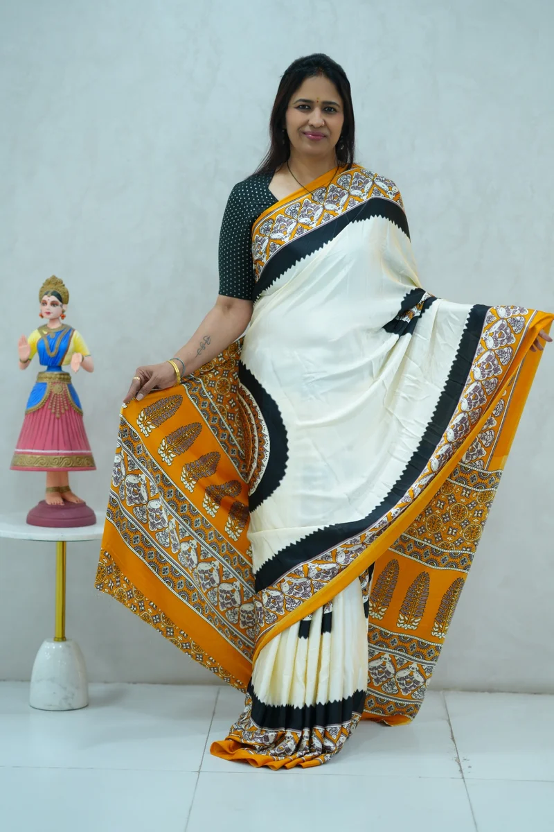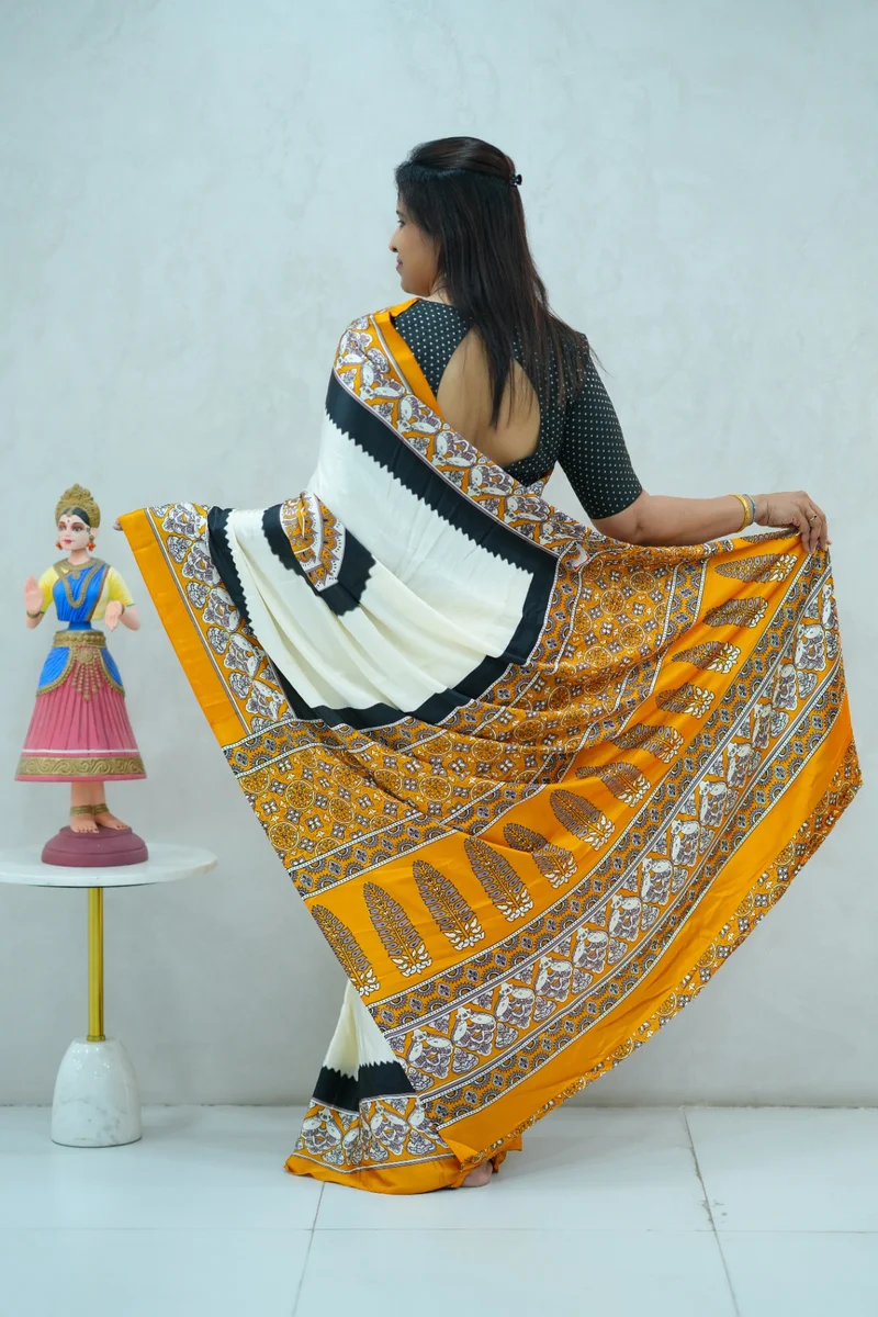 Description: Satin Silk Saree in yellow, beige and black colour with beautiful print all over, printed border and pallu with contrast blouse 1. Material: Satin Silk 2. Blouse: attached