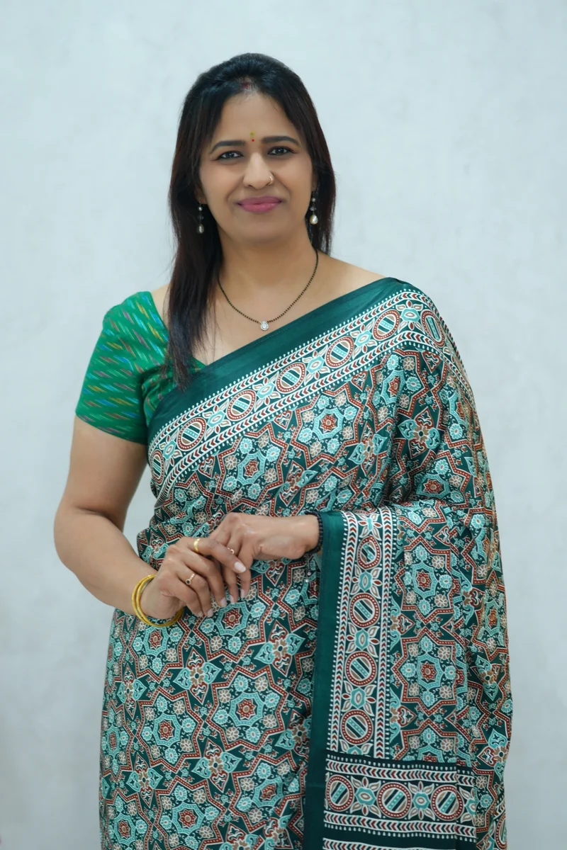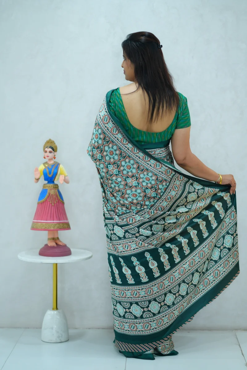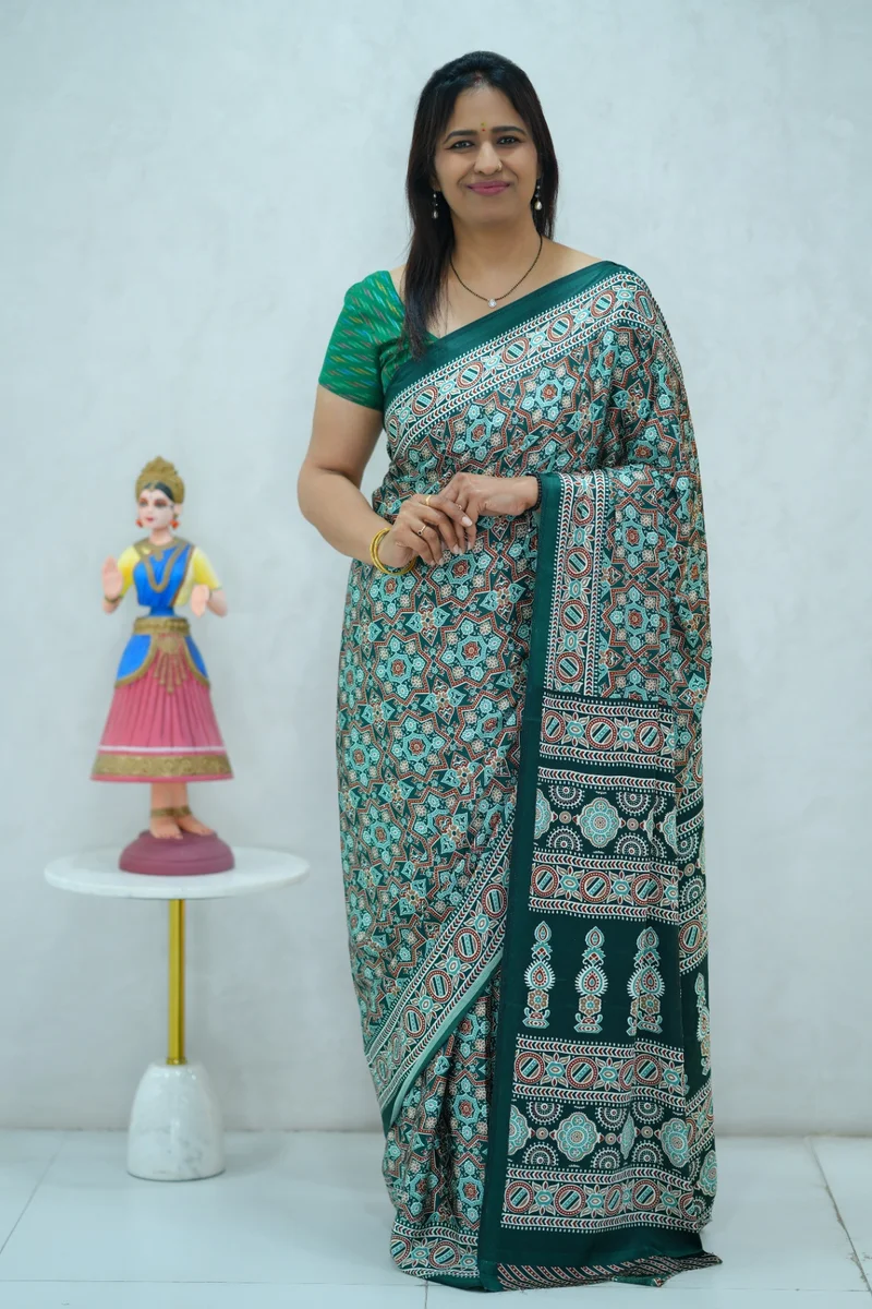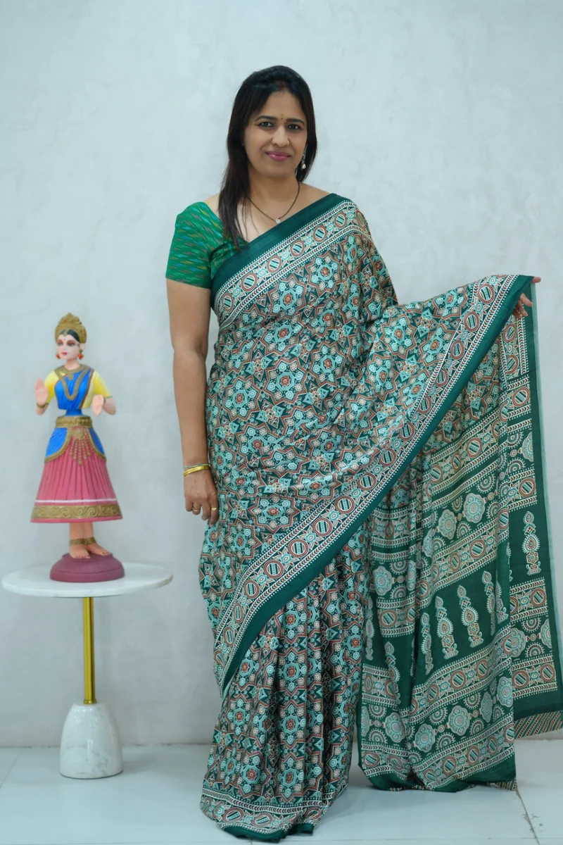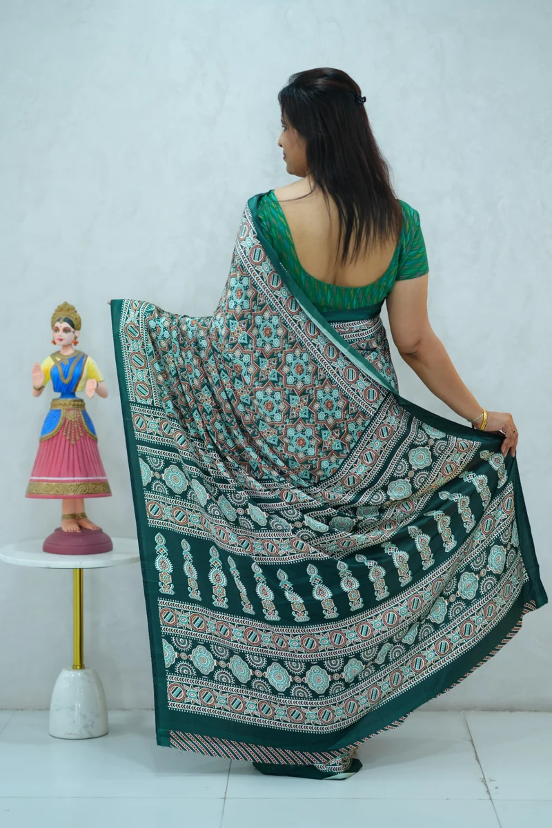 Description: Satin Silk Saree single tone green shade with all over floral and ajrakh print pallu and blouse 1. Material: Satin Silk 2. Blouse: attached