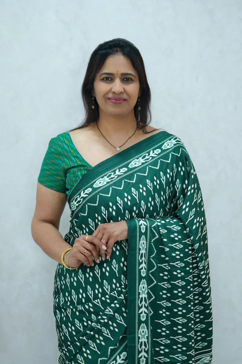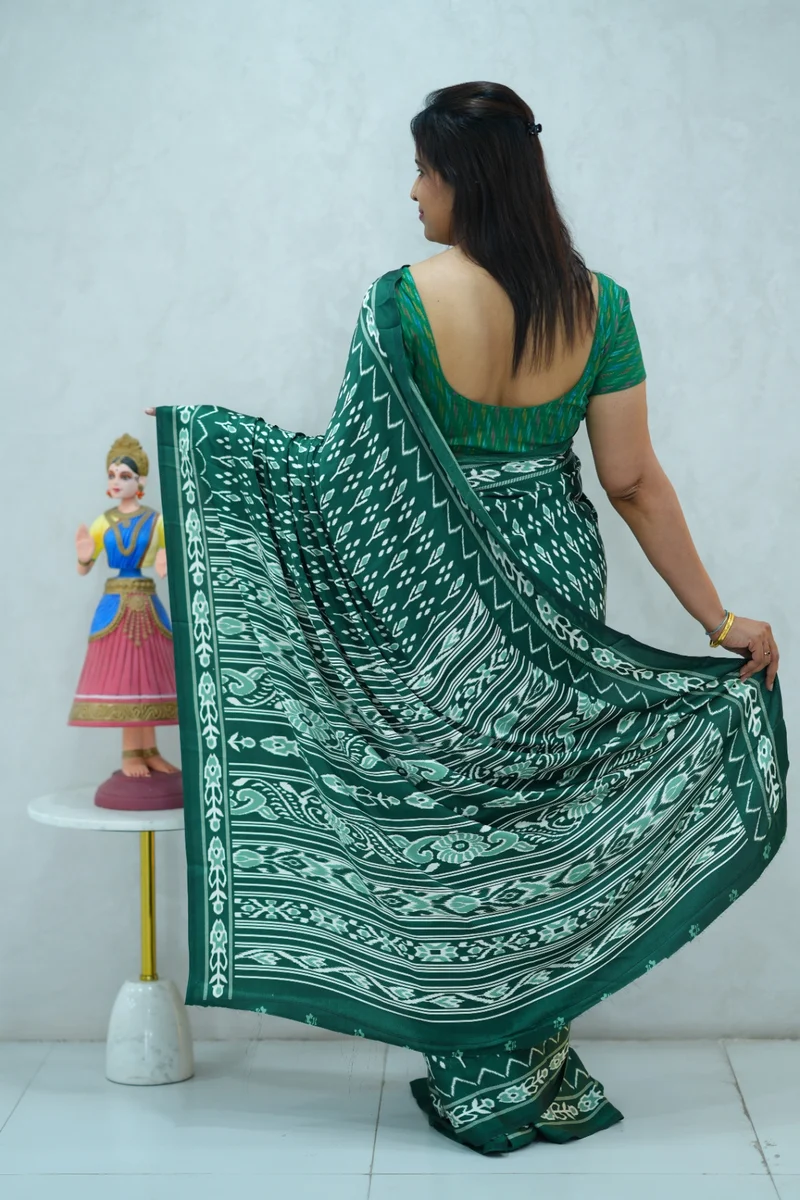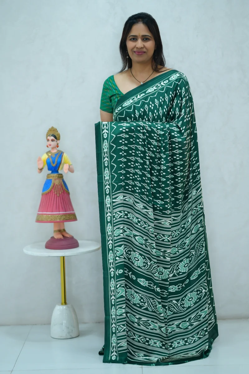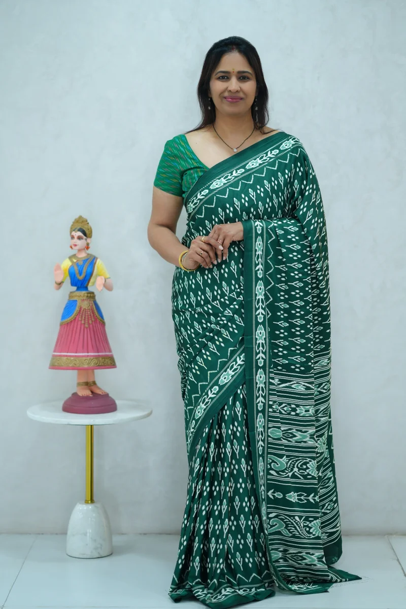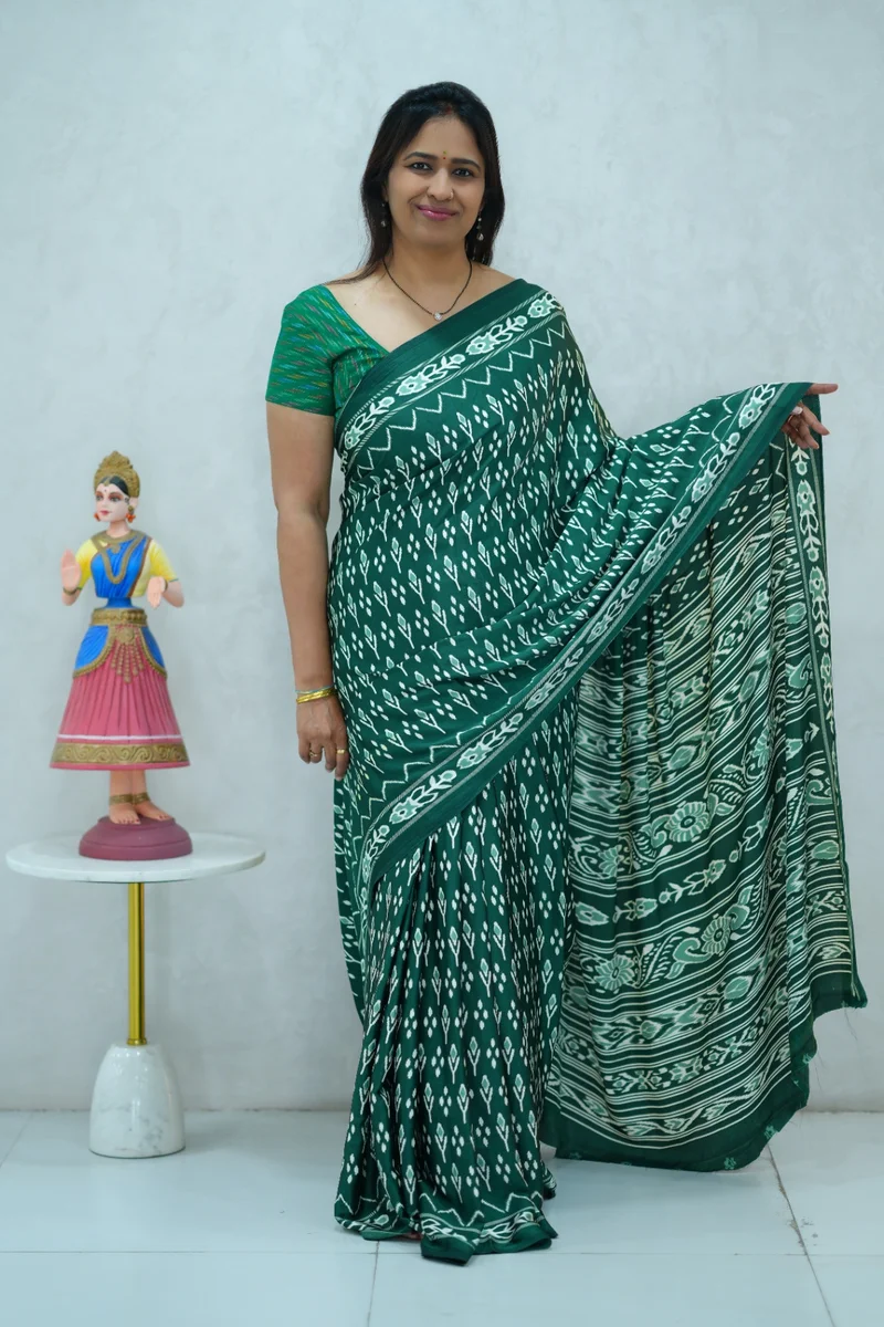 Description: Satin Silk Saree single tone green shade with all over ikkat print pallu and blouse 1. Material: Satin Silk 2. Blouse: attached