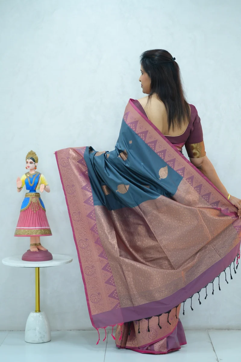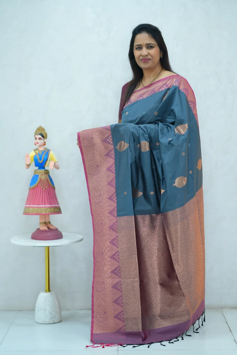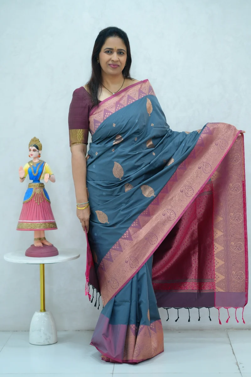 Description: Semi Kanchi Silk saree blue and magenta with zari woven buttas and long rich zari woven border with rich woven pallu and contrast blouse 1. Material: Semi Kanchi Silk 2. Blouse: attached