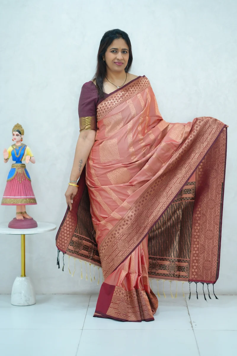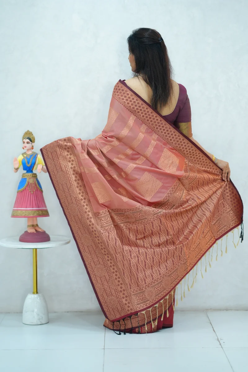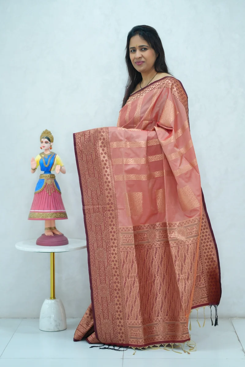 Description: Semi Kanchi Silk saree peach and brown with all over zari weaving and long rich zari woven border with rich woven pallu and contrast blouse 1. Material: Semi Kanchi Silk 2. Blouse: attached