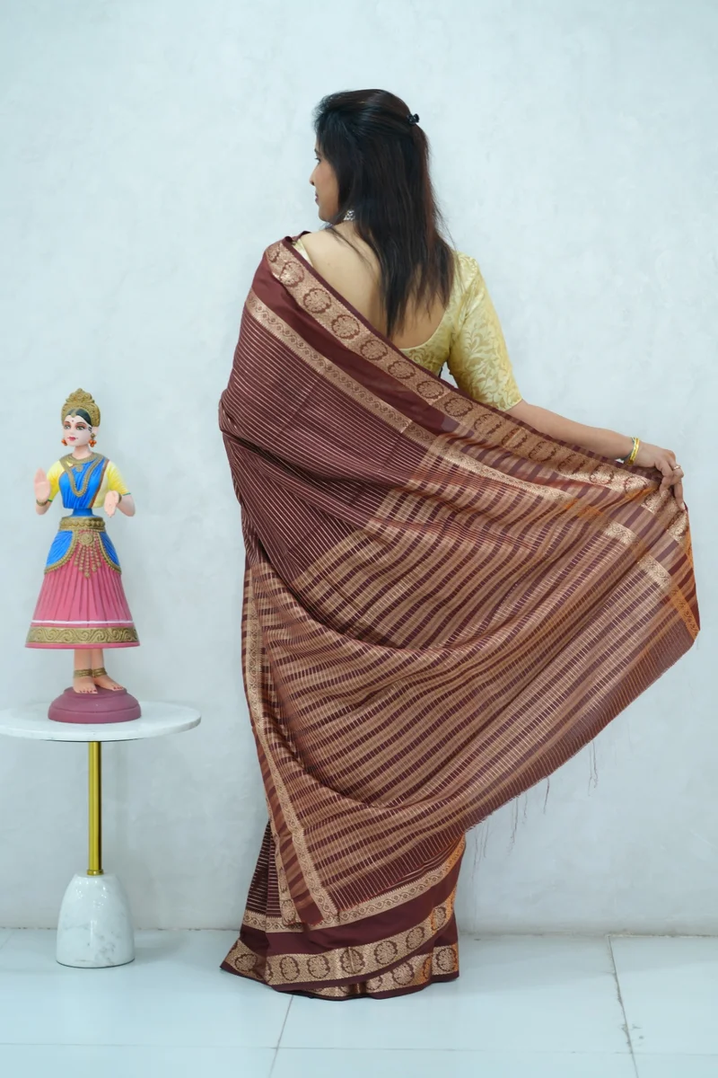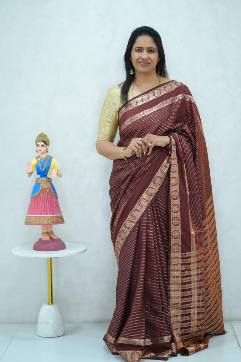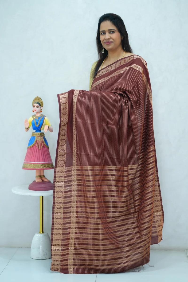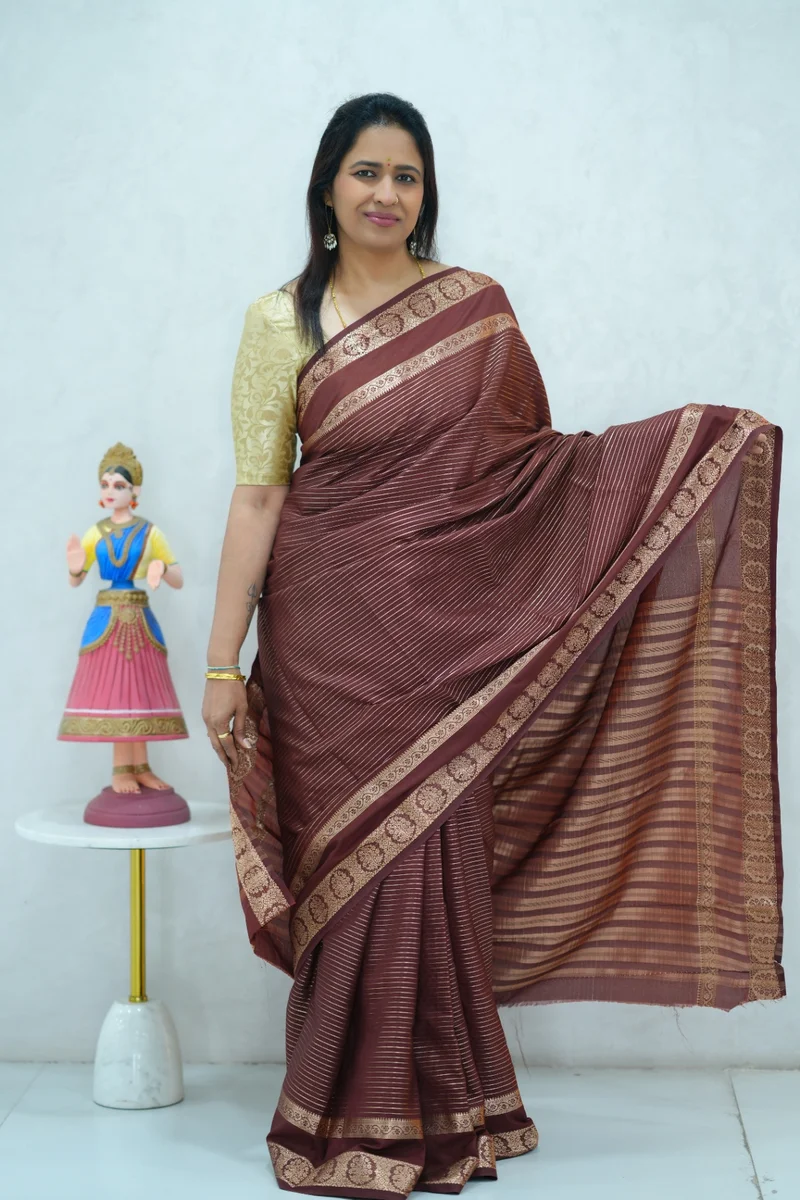 Description: Semi mysore crepe silk saree in single tone brown all over zari weaving, gap border with zari woven pallu and blouse 1. Material: Semi Crepe Silk 2. Blouse: attached