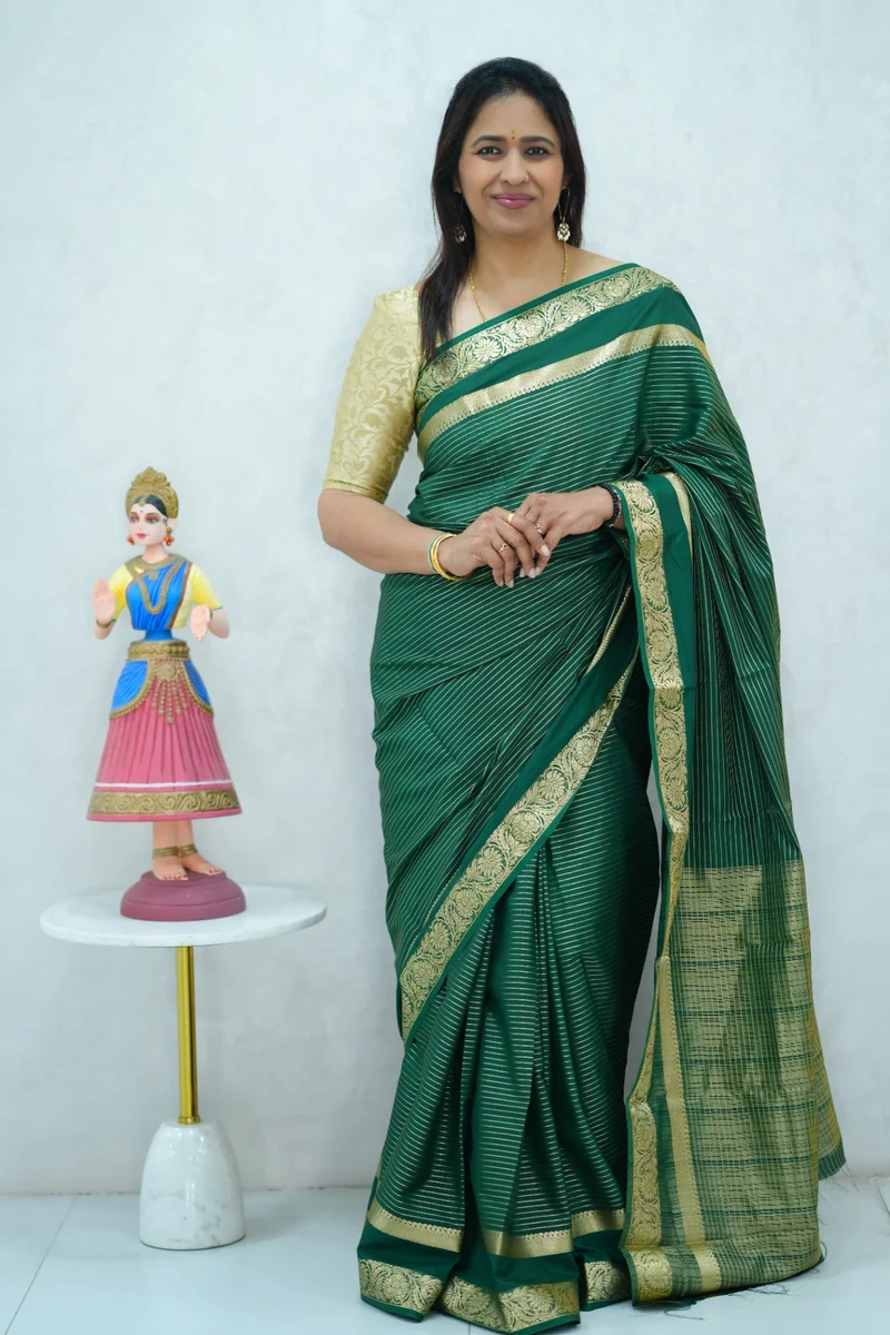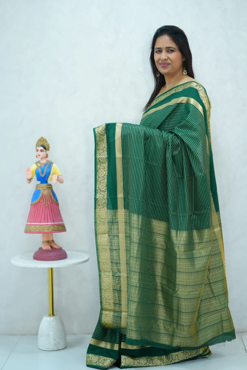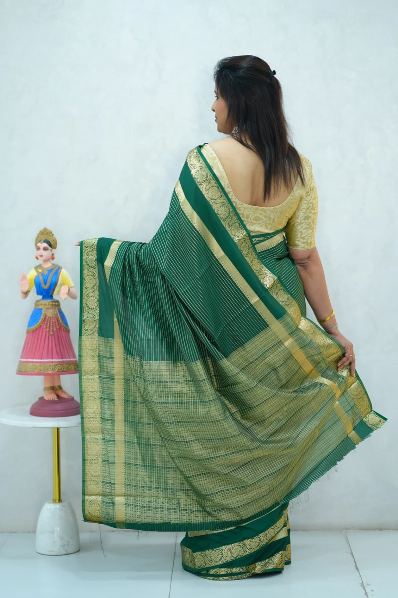 Description: Semi mysore crepe silk saree in single tone green all over zari weaving, gap border with zari woven pallu and blouse 1. Material: Semi Crepe Silk 2. Blouse: attached
