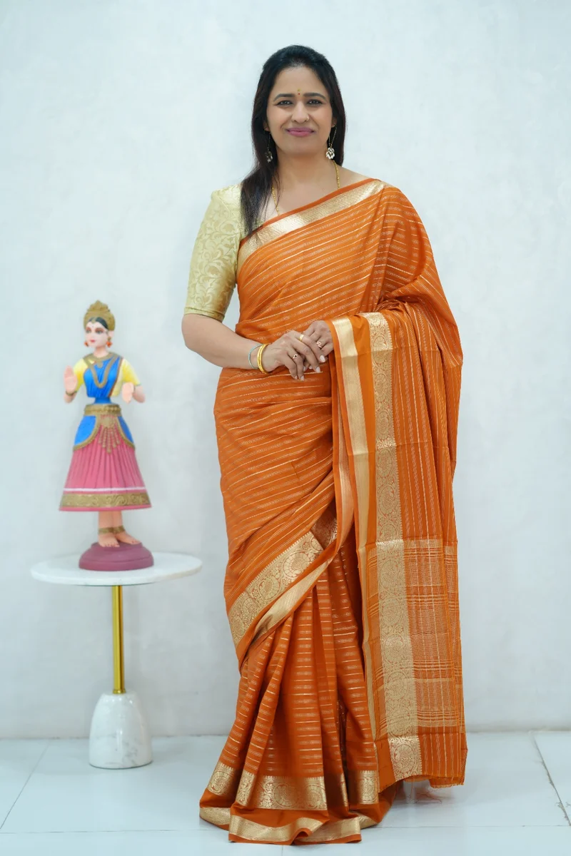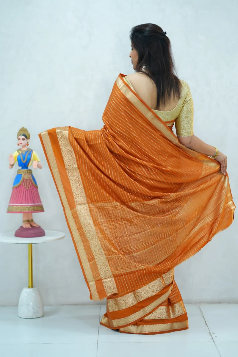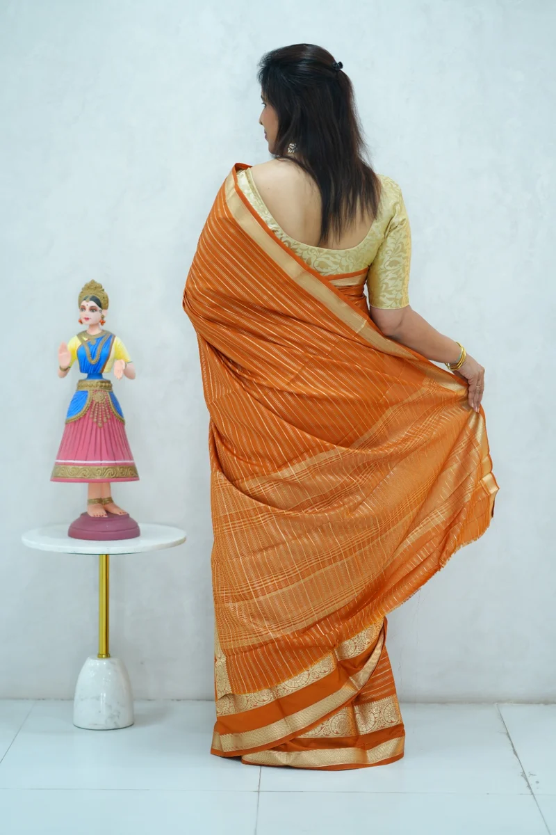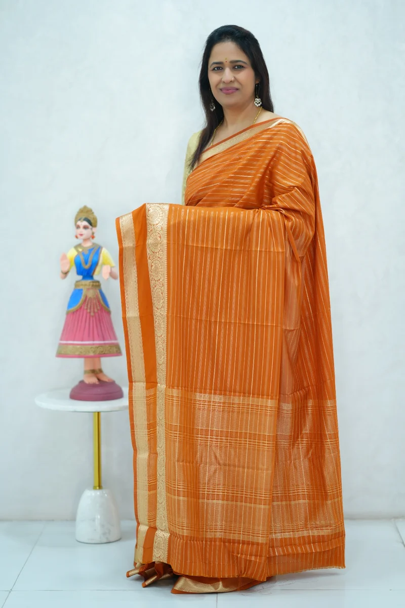 Description: Semi mysore crepe silk saree in single tone mustard yellow shade all over zari weaving, gap border with zari woven pallu and blouse 1. Material: Semi Crepe Silk 2. Blouse: attached