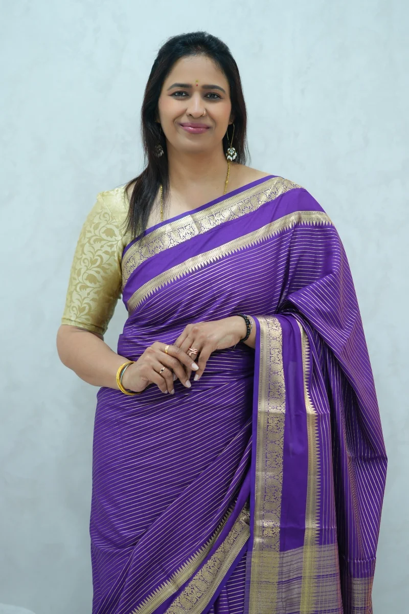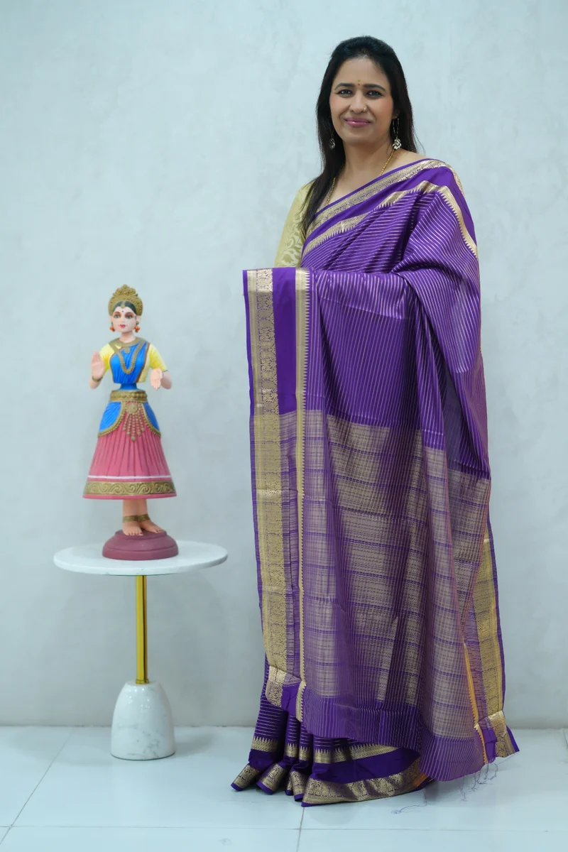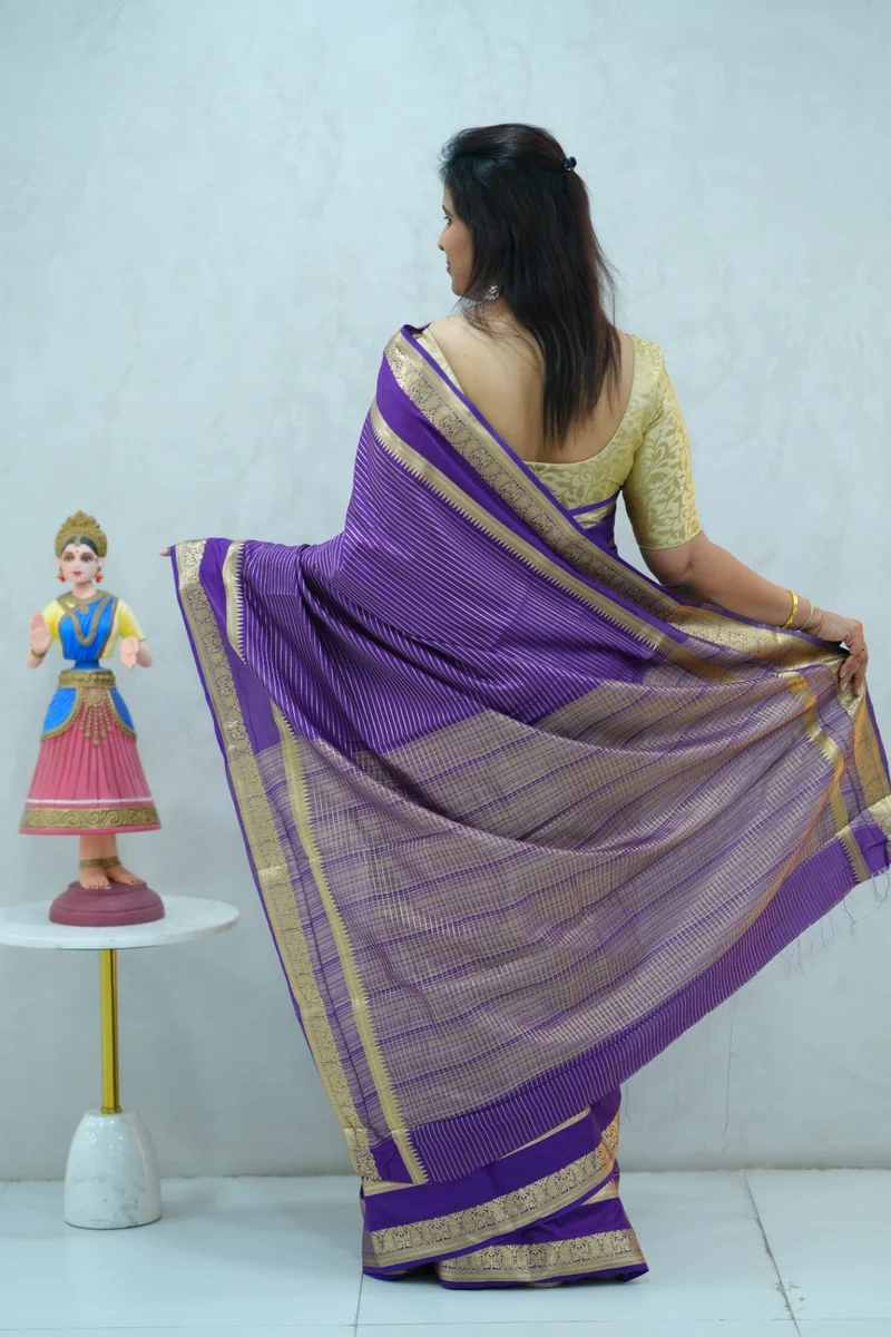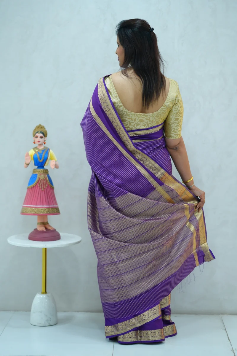 Description: Semi mysore crepe silk saree in single tone purple all over zari weaving, gap border with zari woven pallu and blouse 1. Material: Semi Crepe Silk 2. Blouse: attached