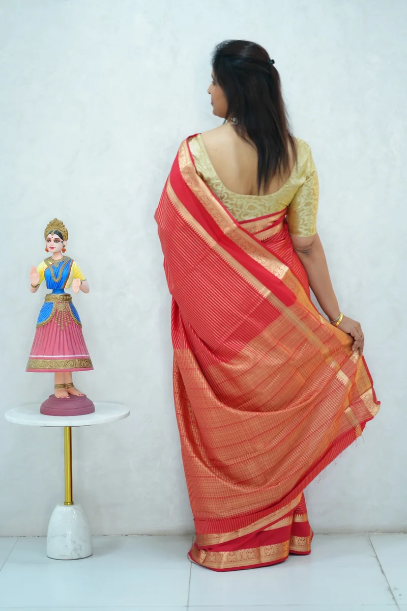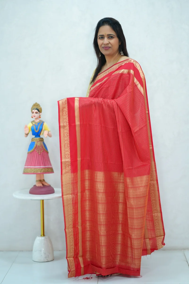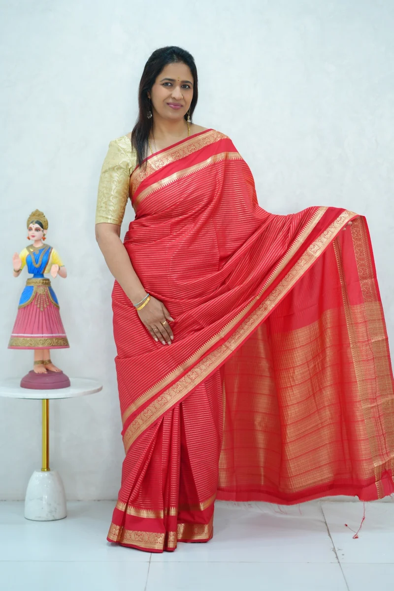 Description: Semi mysore crepe silk saree in single tone red all over zari weaving, gap border with zari woven pallu and blouse 1. Material: Semi Crepe Silk 2. Blouse: attached