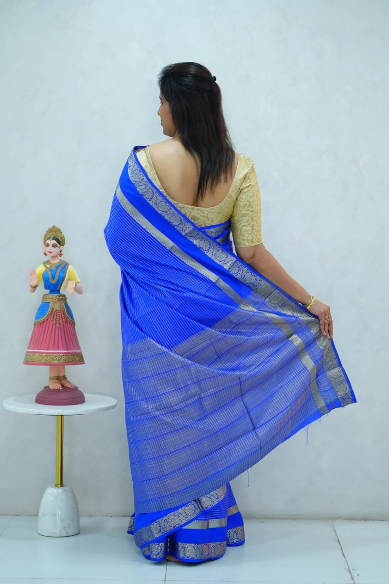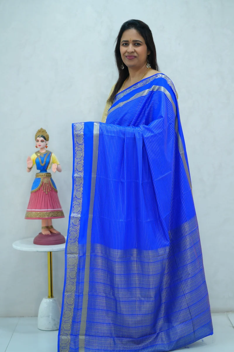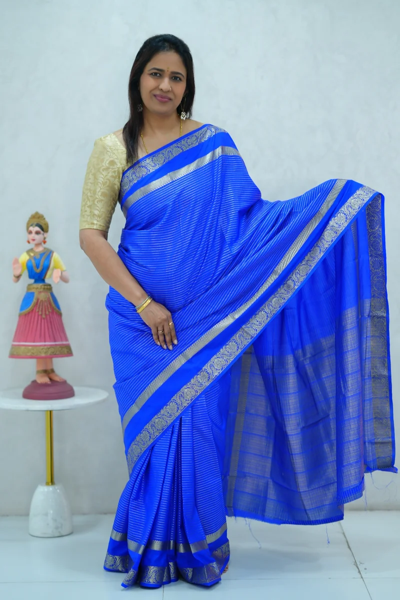 Description: Semi mysore crepe silk saree in single tone royal blue shade all over zari weaving, gap border with zari woven pallu and blouse 1. Material: Semi Crepe Silk 2. Blouse: attached