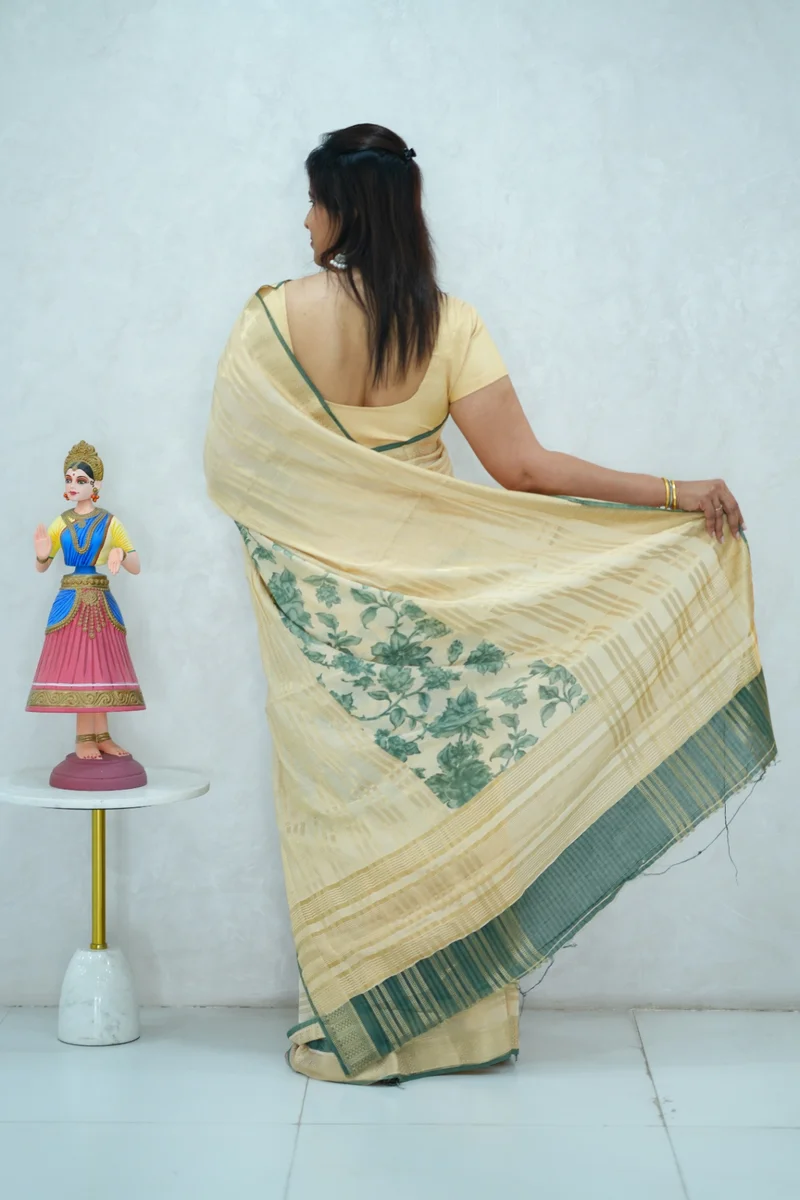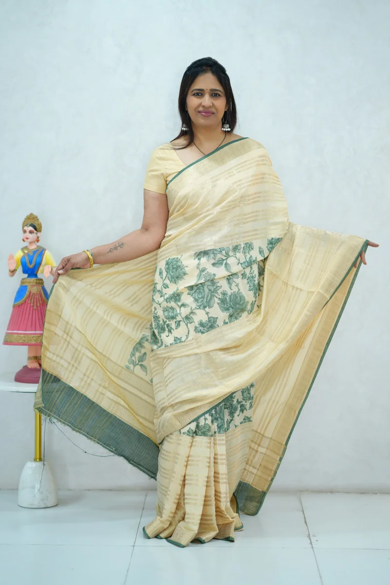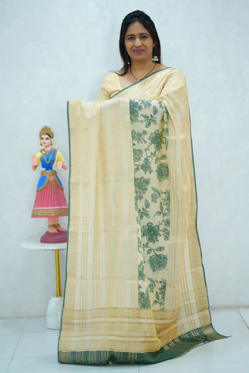 Description: Soft cotton saree in beige with green floral print and all over zari weaving and woven border, pallu and blouse 1. Material: Soft Cotton Saree 2. Blouse: attached