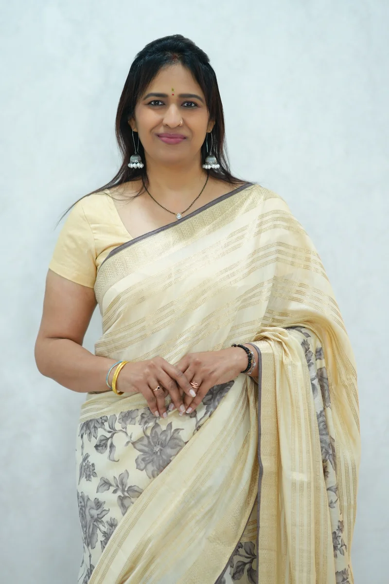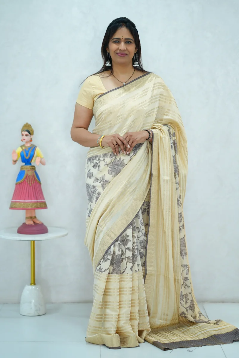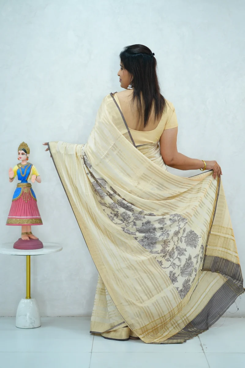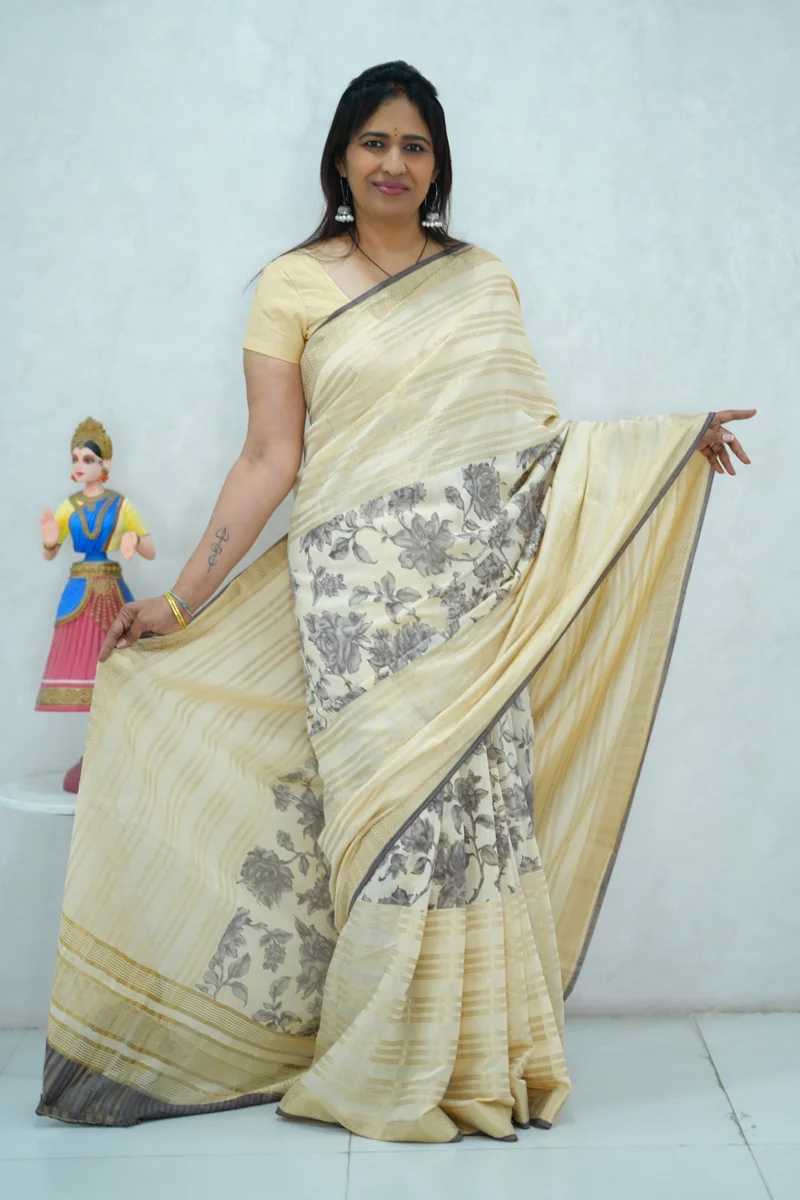 Description: Soft cotton saree in beige with grey floral print and all over zari weaving and woven border, pallu and blouse 1. Material: Soft Cotton Saree 2. Blouse: attached