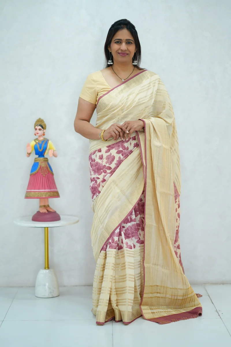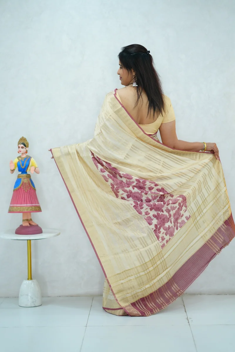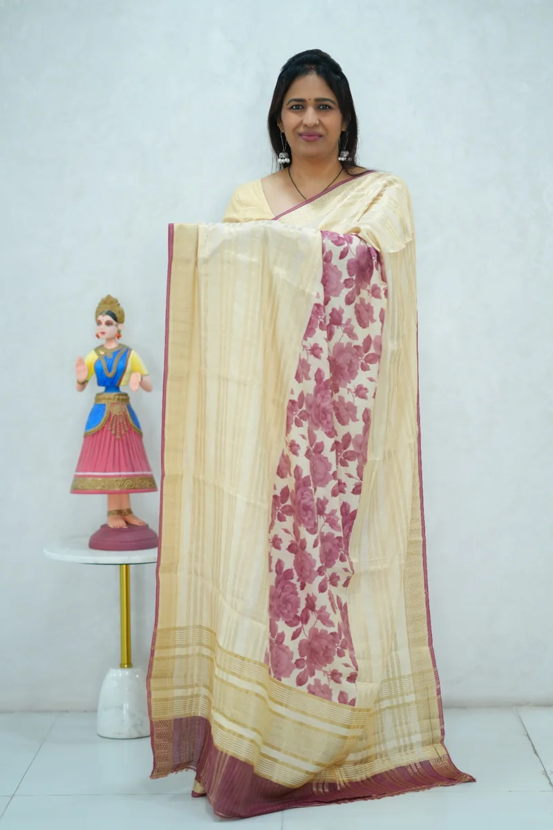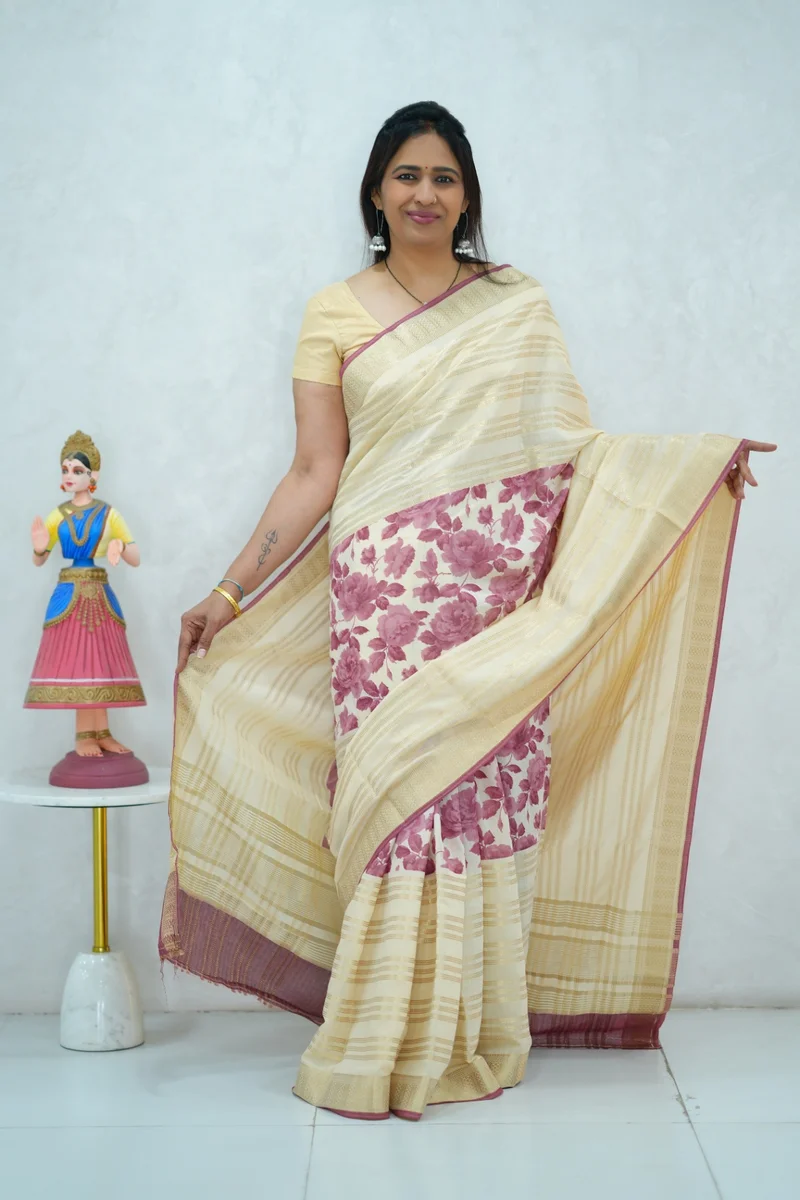 Description: Soft cotton saree in beige with reddish pink floral print and all over zari weaving and woven border, pallu and blouse 1. Material: Soft Cotton Saree 2. Blouse: attached